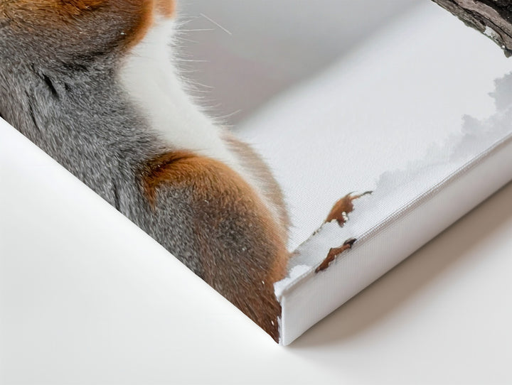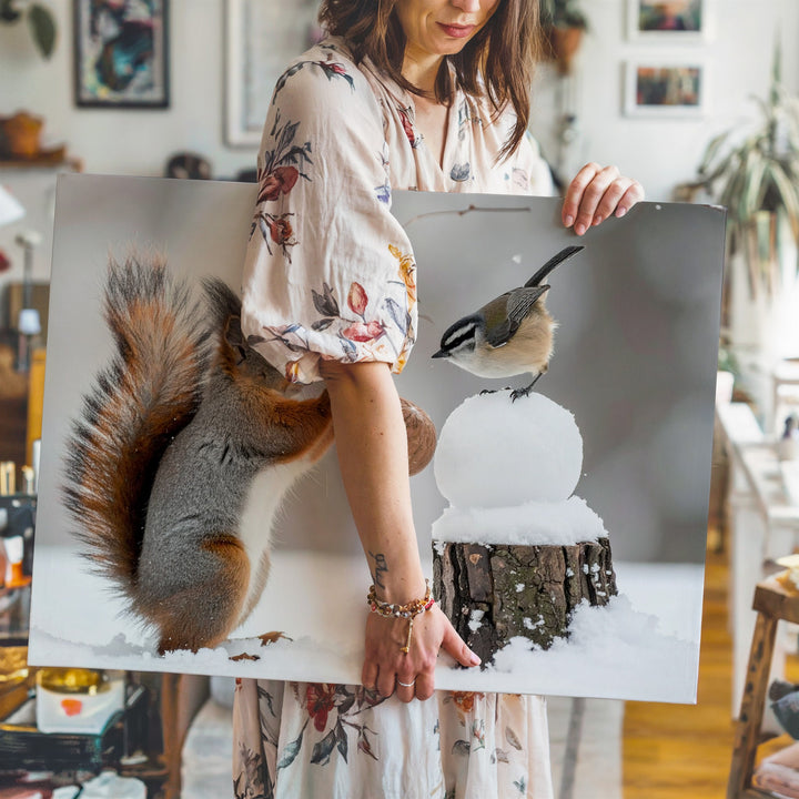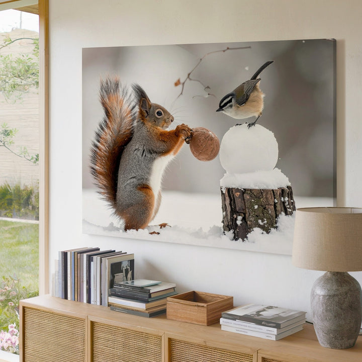 This charming winter canvas captures a magical woodland moment: a red squirrel, standing upright with its bushy tail high, holds a snowball as a tiny bird perches playfully atop it. Their curious gaze meets in silent delight, frozen in a moment of snowy mischief and warmth. With soft lighting, blurred neutral tones, and expressive detail, this scene brings whimsy, tenderness, and woodland imagination to life.