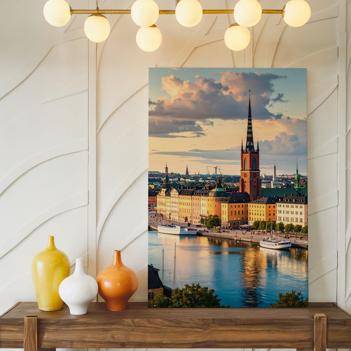 This panoramic canvas captures a stunning view of Stockholm, bathed in the golden glow of late afternoon light. The colorful historic buildings, painted in soft yellows, pinks, and whites, line the waterfront, with the spire-topped church rising elegantly above the others. The dramatic sky, filled with orange and blue-tinted clouds, reflects in the calm water below, enhancing the peaceful ambiance. Boats are gently moored along the shore, and the mix of classical and baroque architecture adds a layer of timeless charm to the scene. This piece evokes a sense of calm, order, and elegance—perfect for any space.