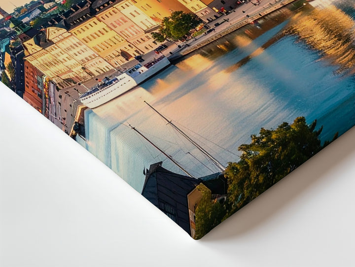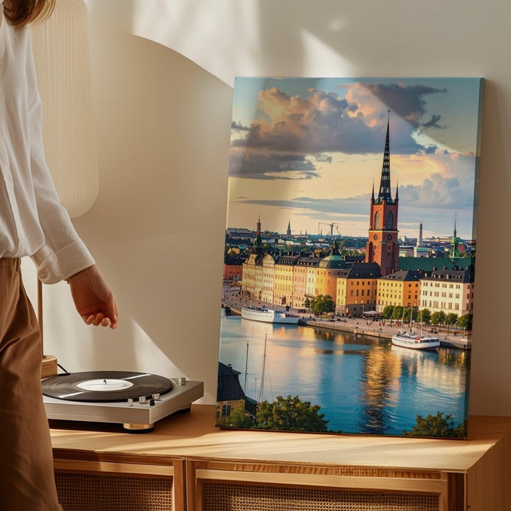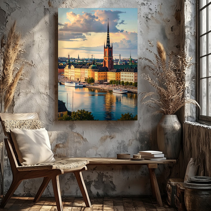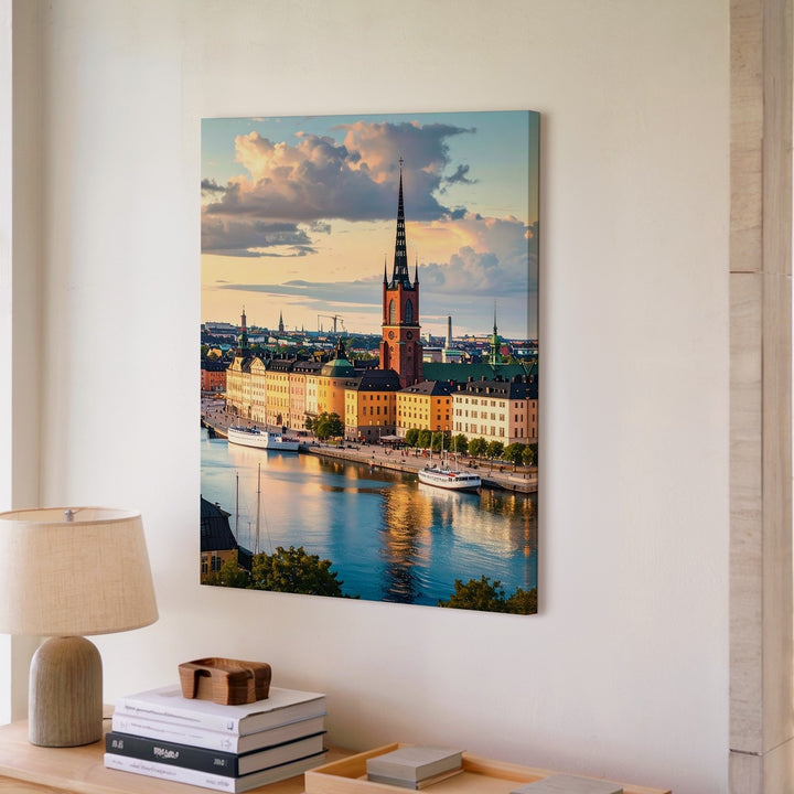 Stockholm Waterfront Canvas – Warm European Cityscape with Historic Buildings and Spire