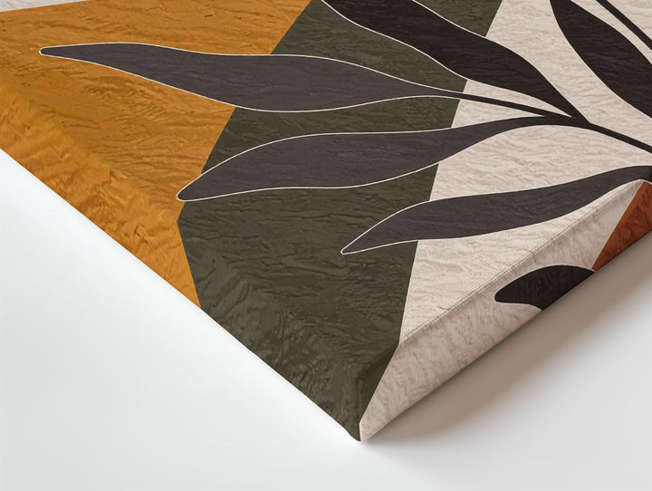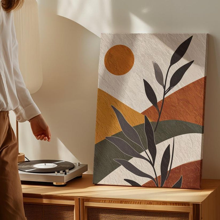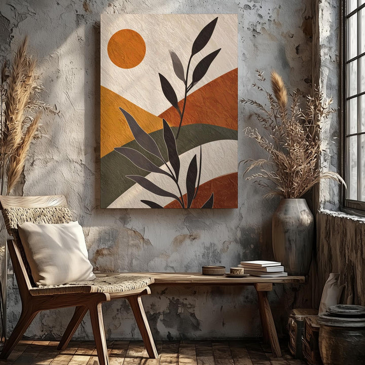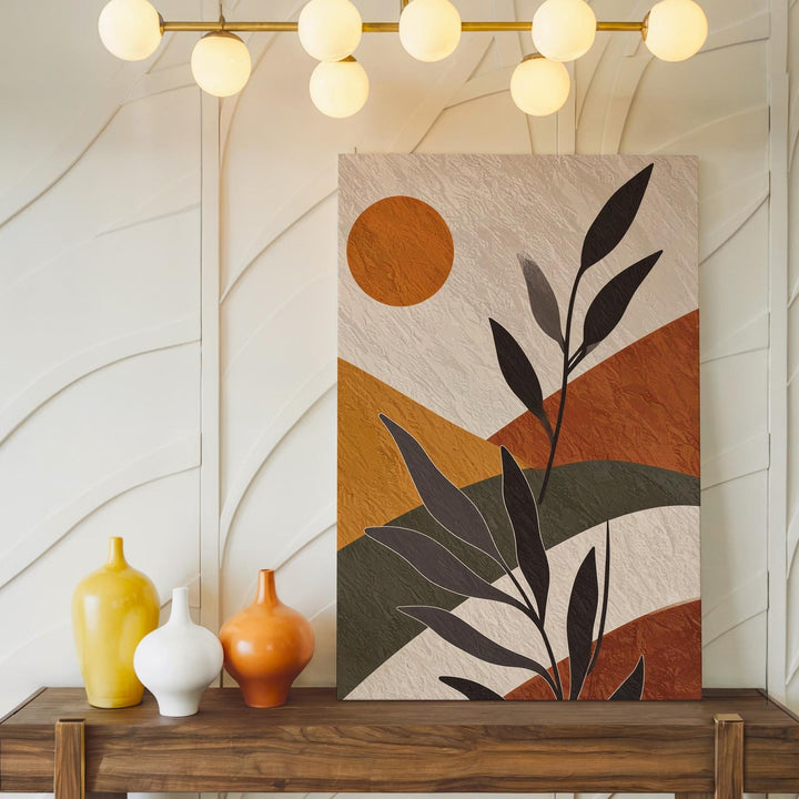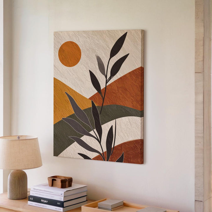 This modern canvas combines geometric abstraction with organic plant forms in a stylized desert landscape. The composition features curved and circular shapes in burnt orange, ochre, and muted green, flowing diagonally across a textured beige background. A large orange sun and overlapping hills define the space, while black silhouette leaves stretch outward, adding contrast and depth. The clean, graphic style is softened by the fabric-like texture, creating a warm, inviting piece that evokes the tranquility of nature and the vibrancy of a desert sunset.