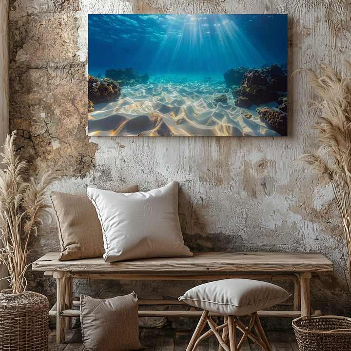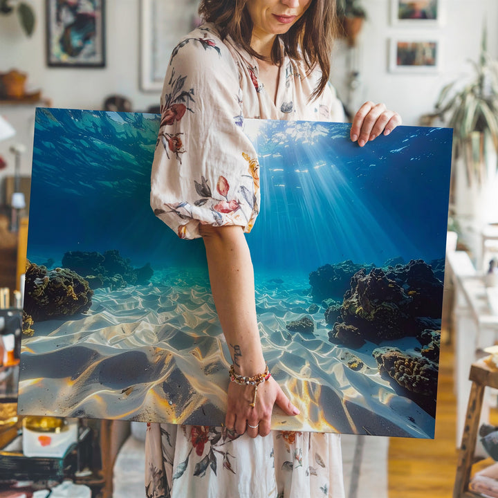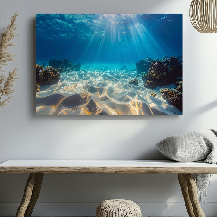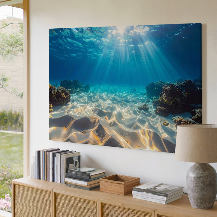 This stunning high-resolution canvas captures the ocean floor bathed in golden shafts of sunlight, revealing rippling sand and scattered rocks beneath vibrant blue waters. With no creatures in sight, the scene focuses on the pure beauty of texture, light, and pristine aquatic clarity. A peaceful, meditative image that invites calm and spaciousness into any room.
