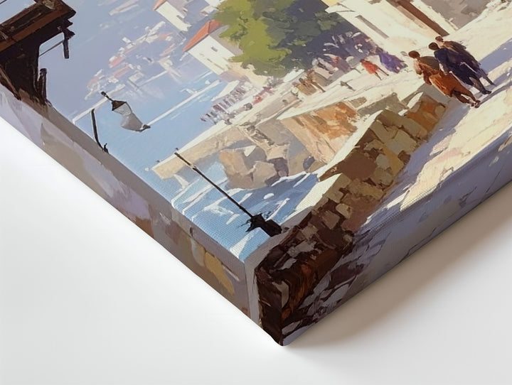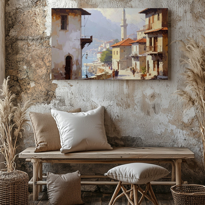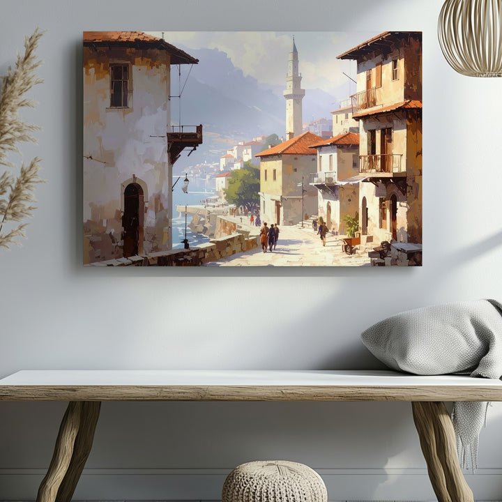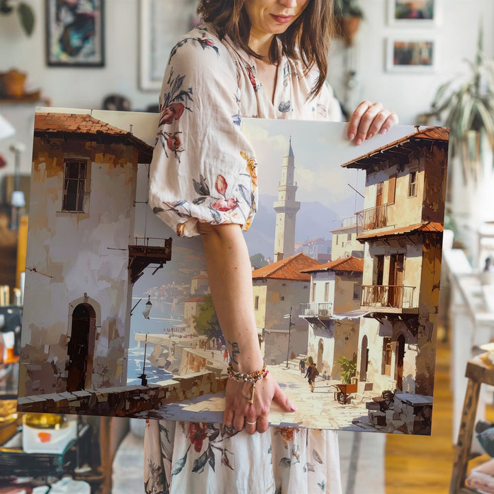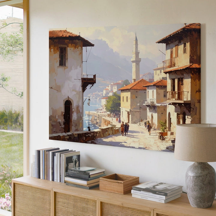 This nostalgic canvas captures a golden morning on a cobbled street, where history lingers in every step. Weathered buildings with wooden balconies and arched windows frame the scene, as figures pass through light and shadow. In the distance, a mist-veiled minaret rises above the rooftops, anchoring the image in spiritual and cultural heritage. With its earthy tones and soft light, the artwork brings the timeless serenity of a Mediterranean or Middle Eastern town into your space.