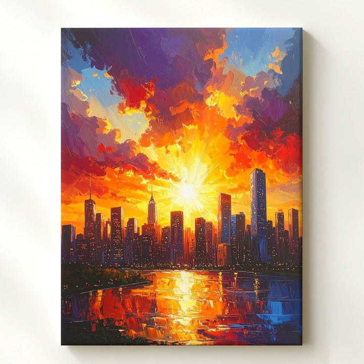 Ideal for modern spaces, urban-themed rooms, or anyone who loves the mesmerizing beauty of city sunsets.