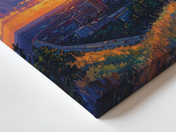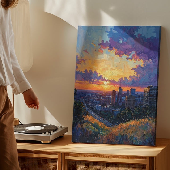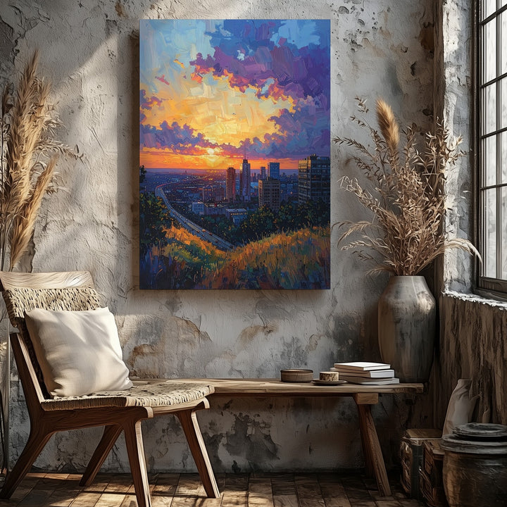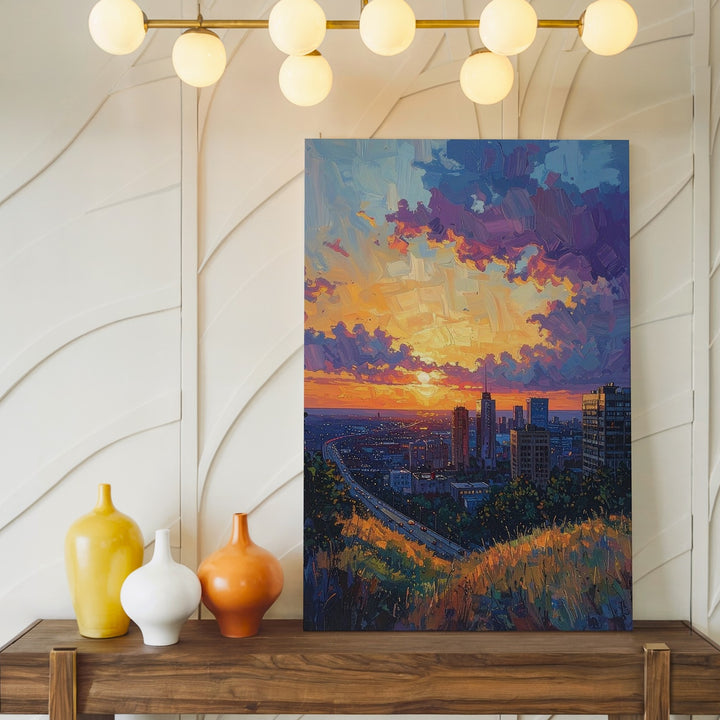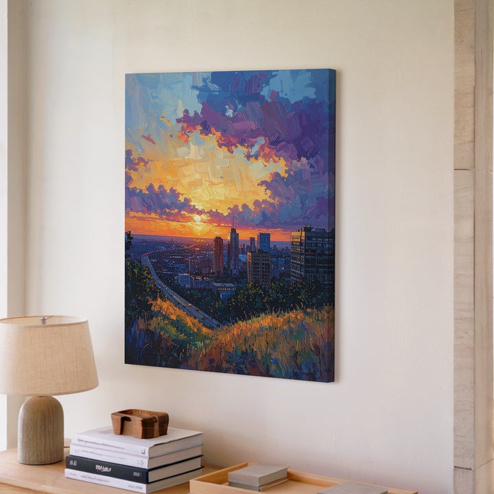 This vibrant, painterly canvas captures a sweeping city view at sunset, where the warm orange and pink glow of the sun contrasts with the deep purple and blue clouds above. The modern cityscape, seen from an elevated perspective, is framed by a prominent highway running through the center, with grassy hills and trees blending seamlessly into the urban environment. The expressive brush strokes in the sky evoke a sense of grand transition, offering a cinematic moment of peace as day turns into night.