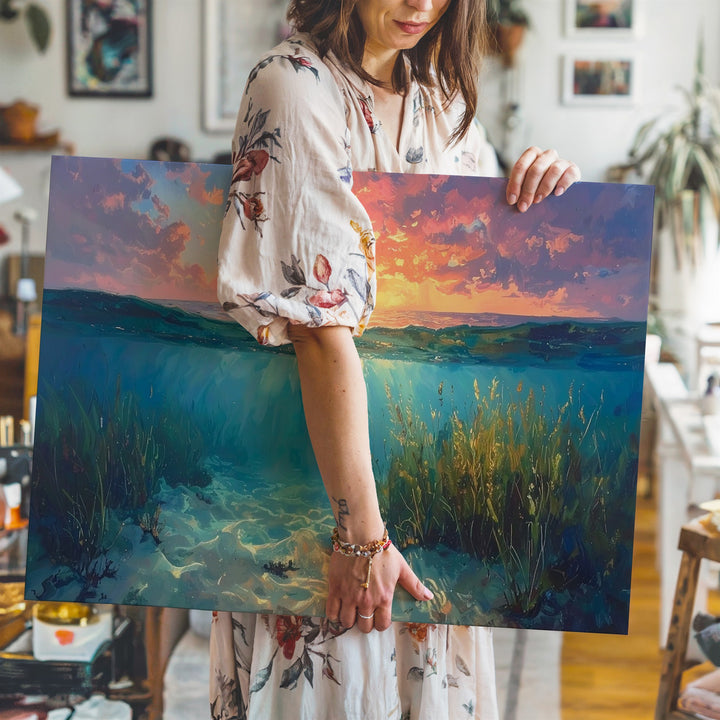 This panoramic underwater canvas captures a rare and balanced view where sea and sky become one. The lower half reveals tall seagrass swaying gently in clear, shallow water, while above, a glowing sunset paints the surface in dreamy hues of pink, orange, and purple. Light filters through both realms, creating a soft radiance that turns this seascape into a meditative union of earth, water, and sky. A perfect moment, suspended in clarity and calm.