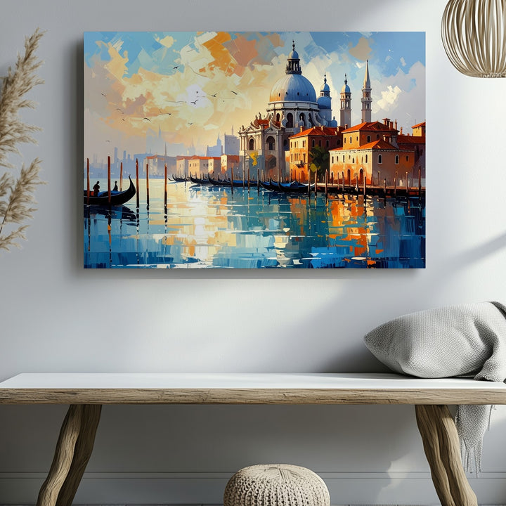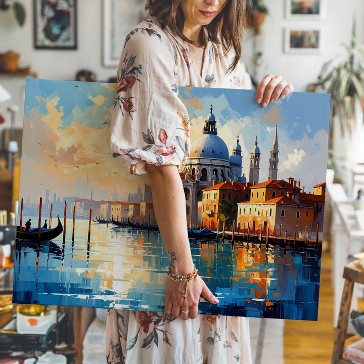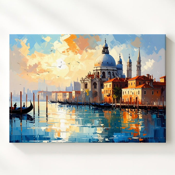 This ethereal canvas captures the stillness of a timeless city at the edge of dawn or dusk. Domed rooftops and slender spires rise in quiet harmony above mirror-still waters, their reflections glowing in soft hues of peach, gold, and blue. Gondola-like boats drift silently across the scene, while distant birds glide above the skyline. Rendered in digital impressionism, the piece feels suspended in time—blending architectural elegance with spiritual calm.