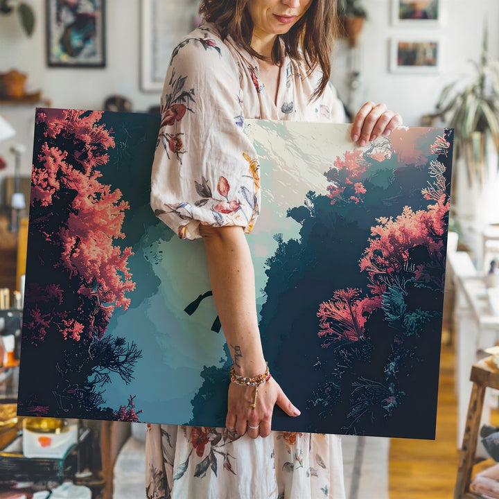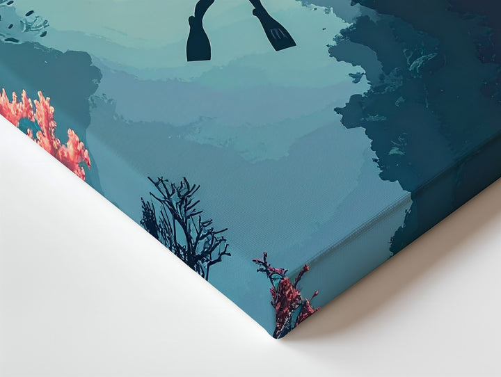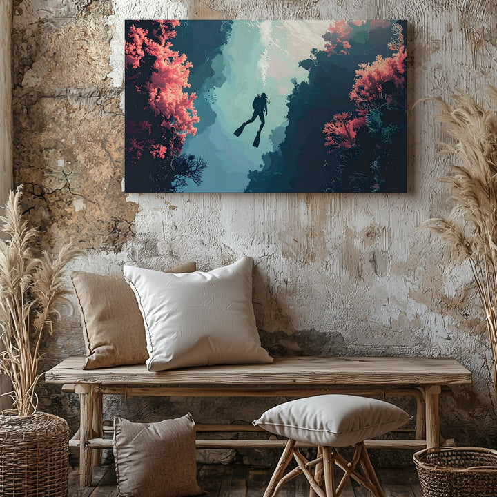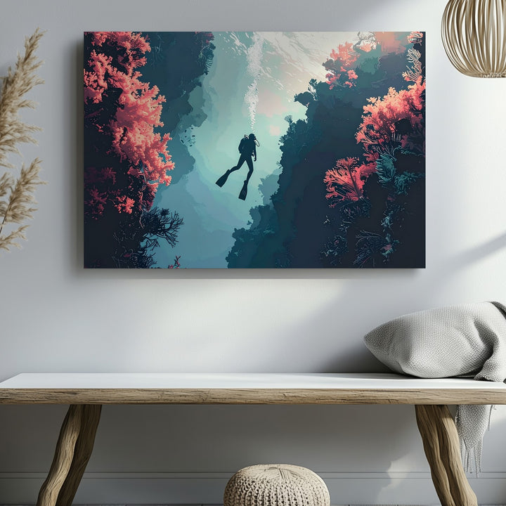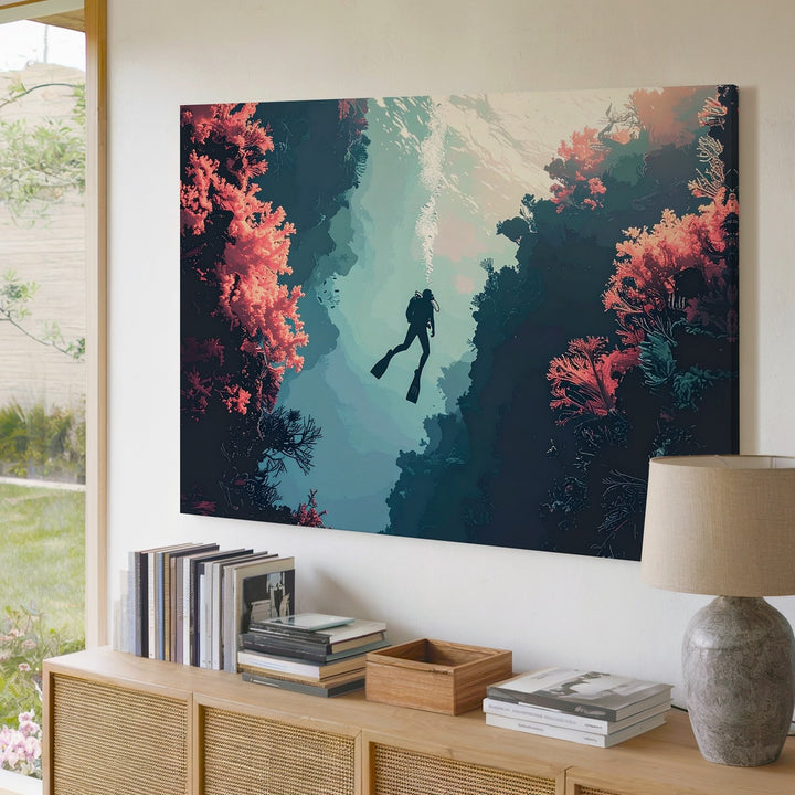 Dream Descent Canvas – Surreal Diver Between Coral Cliffs
