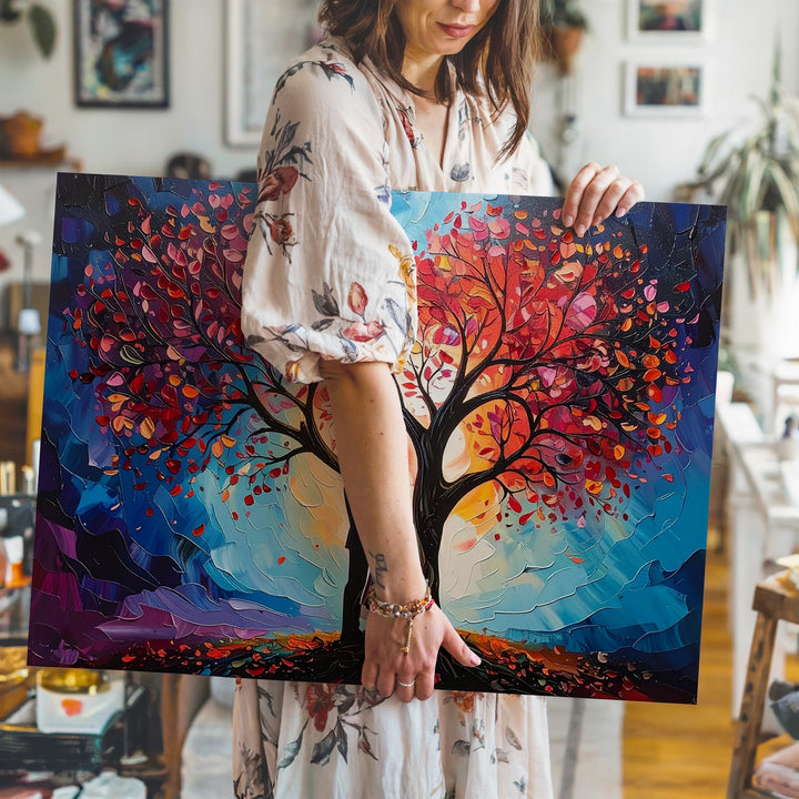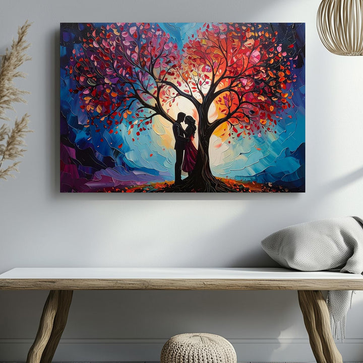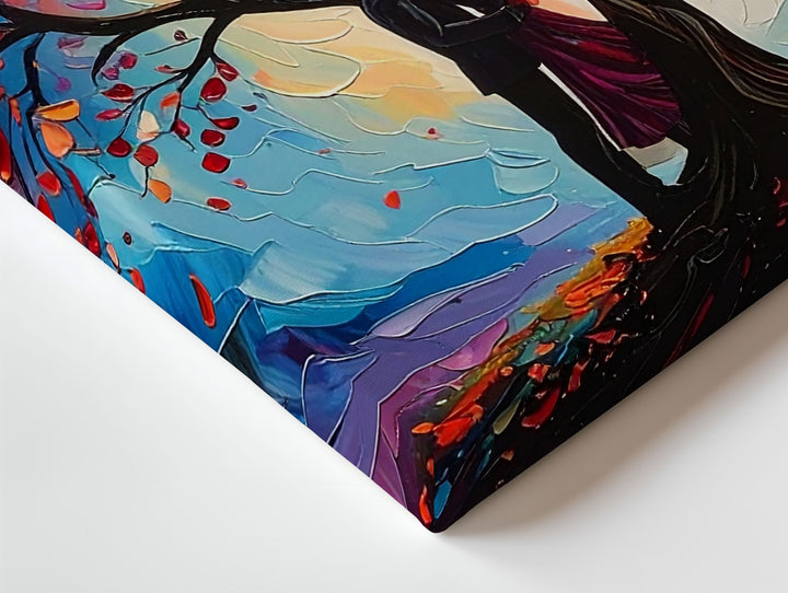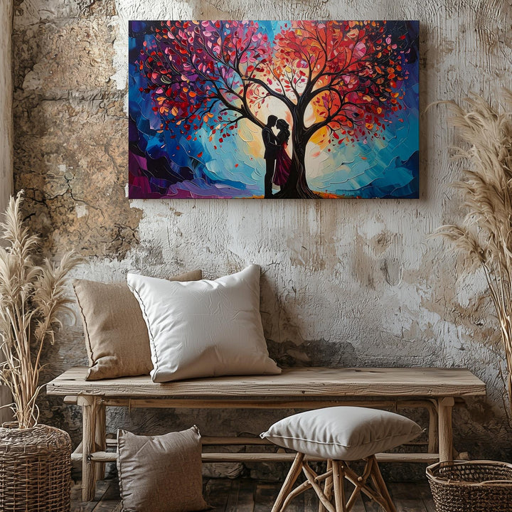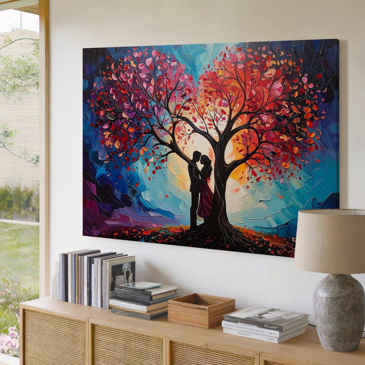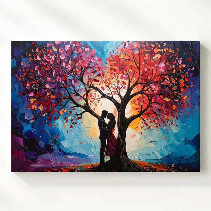 This enchanting canvas paints a moment of surreal romance beneath a heart-shaped tree, where silhouetted lovers embrace under swirling coral and red leaves. The branches curve like an abstract heart, encircling the couple in warmth and emotion. Behind them, a luminous twilight sky in vivid blues and purples sets the mood, blending magic, motion, and intimacy into a storybook scene that feels both timeless and otherworldly.