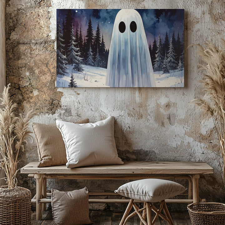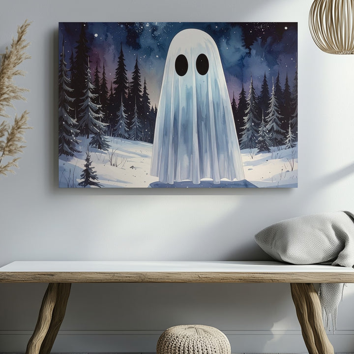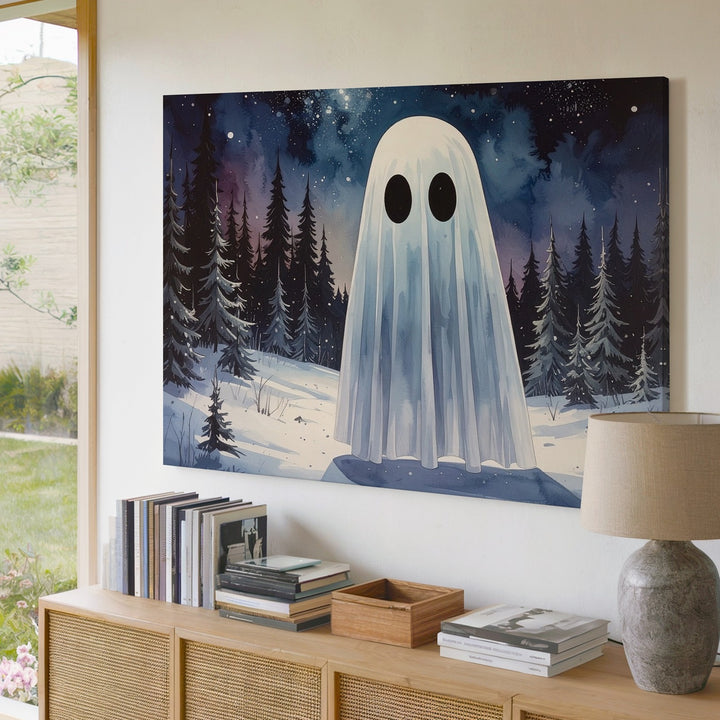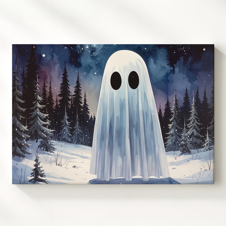 This surreal winter night canvas invites you into a dreamlike scene where a playful ghost figure—draped in a white sheet with wide black eyes—stands alone in a snowy forest clearing. Surrounded by silent evergreens and a sky glittering with stars, the gentle snowfall and moonlit glow create a hauntingly magical contrast. Both eerie and endearing, this artwork blends childlike imagination with a sense of quiet mystery.