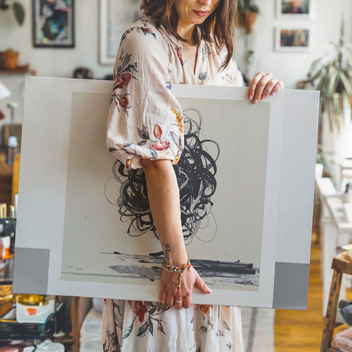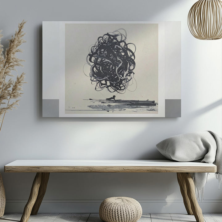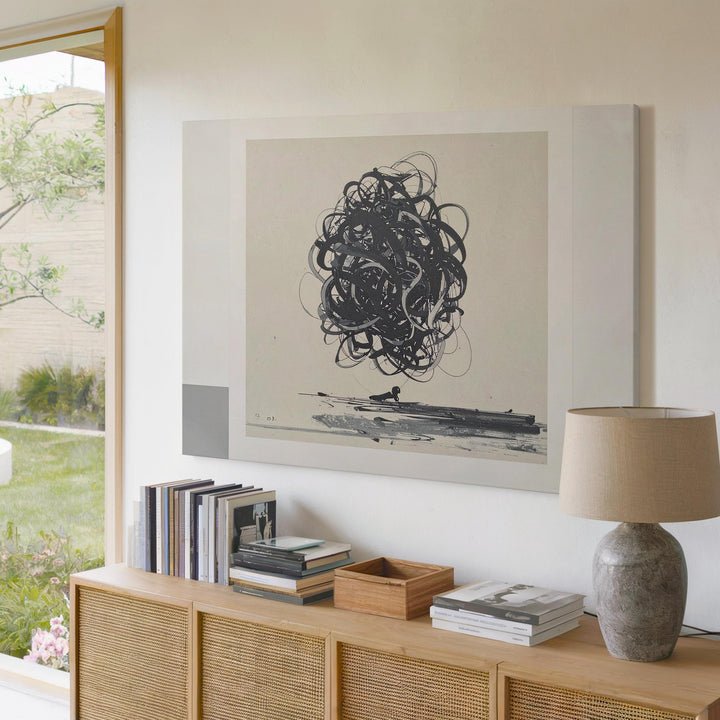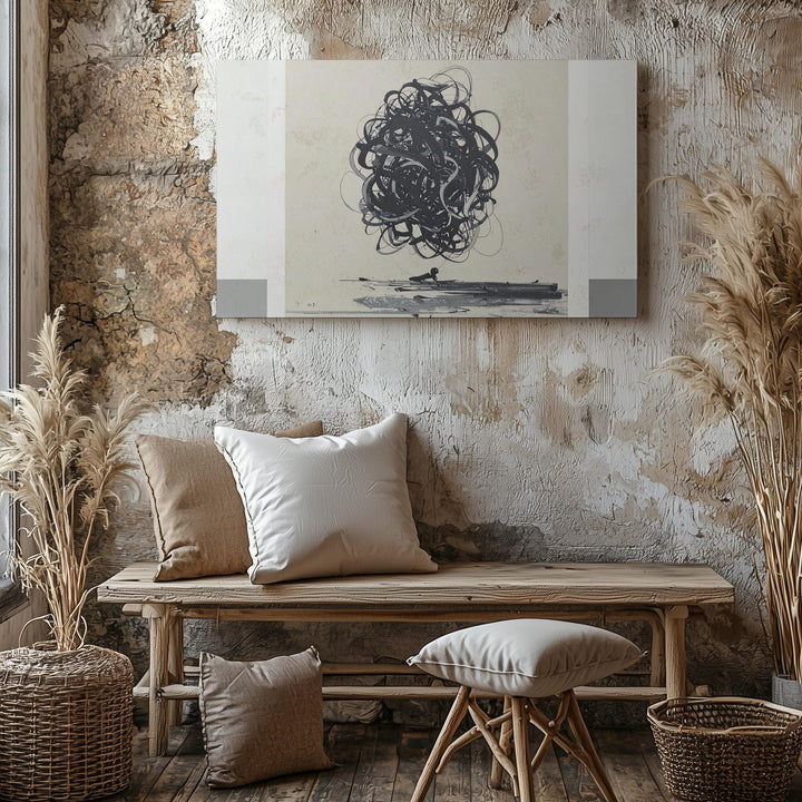 This abstract ink canvas features a dense cluster of looping, ribbon-like lines centered on a textured beige background. The confident, fluid strokes create an energetic yet balanced form that draws the eye into its intricate depths. Framed by a crisp white mat, this piece blends the spontaneity of gesture drawing with modern abstraction, perfect for making a bold statement in contemporary spaces.