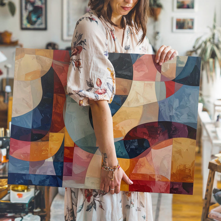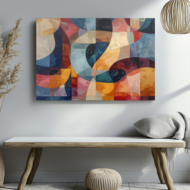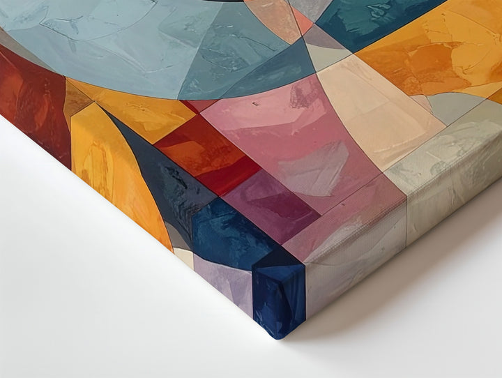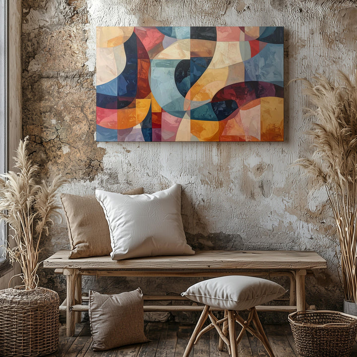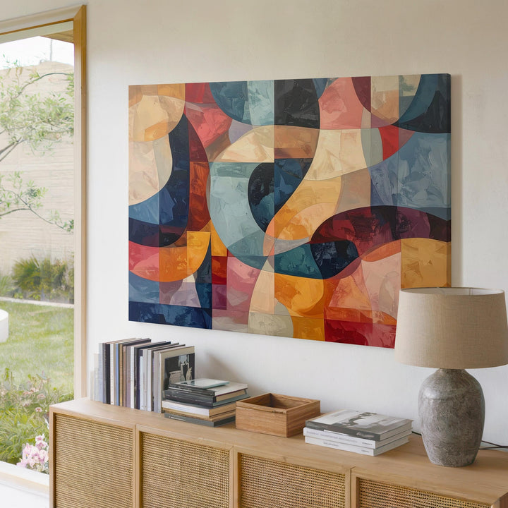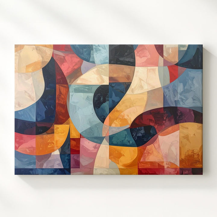 This dynamic abstract canvas features overlapping translucent shapes in a striking blend of blue, orange, red, pink, and mustard. The soft-edged, semi-transparent forms create a rhythmic, layered composition that appears to float and shift in space. The subtle blending of colors where the shapes intersect adds depth and movement, while the bold hues bring modern energy to the piece. The overall feel is light, airy, and full of life, making it a perfect addition to contemporary and energetic spaces.