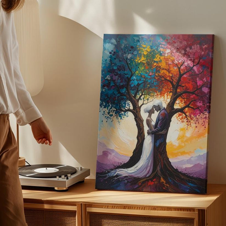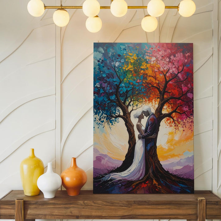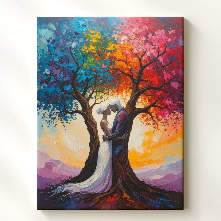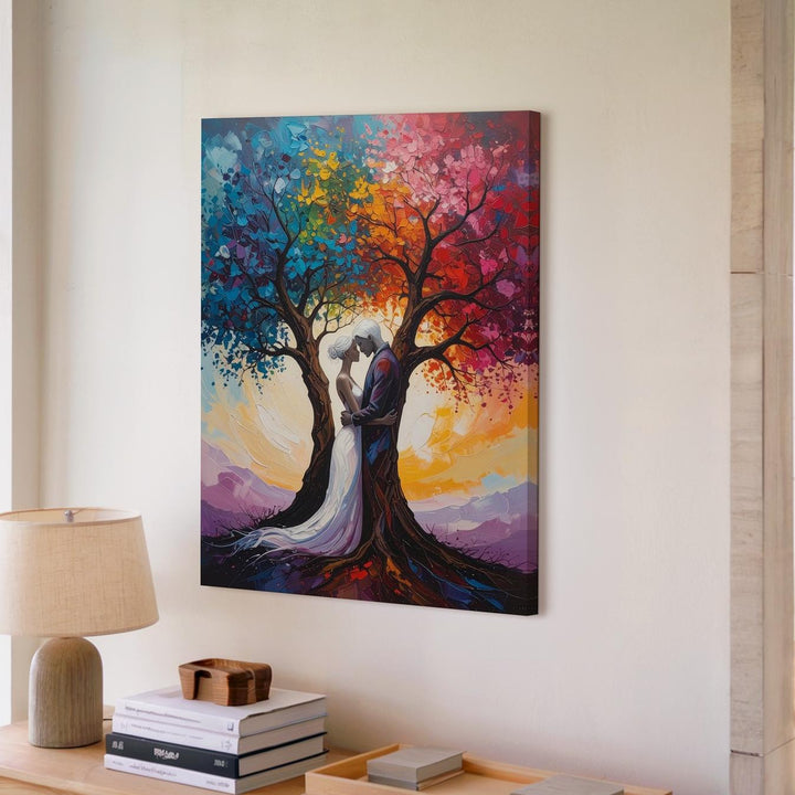 Tree of Love Canvas – Embracing Figures Merged with Vibrant Trees