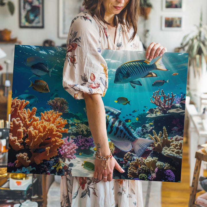 This vivid underwater canvas captures a kaleidoscope of life beneath the waves—a reef alive with bright orange, yellow, and purple corals, and bustling with tropical fish like angelfish, butterflyfish, and damselfish. Rays of sunlight pierce the turquoise water, illuminating bubbles, textures, and motion. It’s a living snapshot of ocean harmony—bursting with energy, detail, and color to lift the spirit and energize any space.