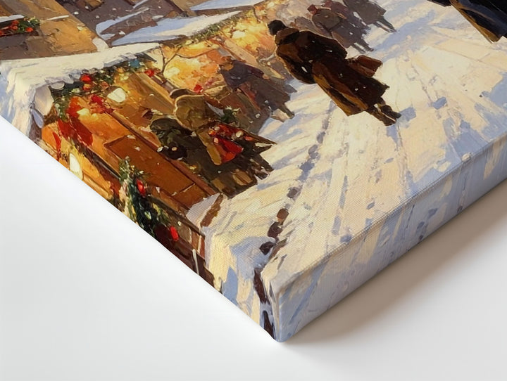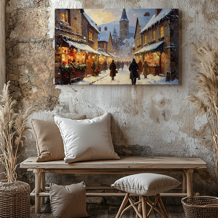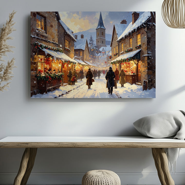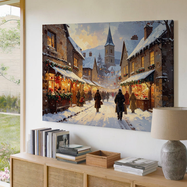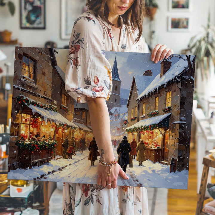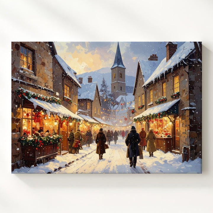 This enchanting winter twilight canvas captures the heart of a festive village, where warmly lit shop windows glow against historic stone facades and soft snow dusts the cobblestone streets. Strolling figures in coats and scarves pause to chat or browse a cozy market stall, while above it all, a church tower stands watch and garlands sway gently in the cold air. Golden light meets cool blue snow in perfect harmony, evoking nostalgia, warmth, and the joy of holiday connection.