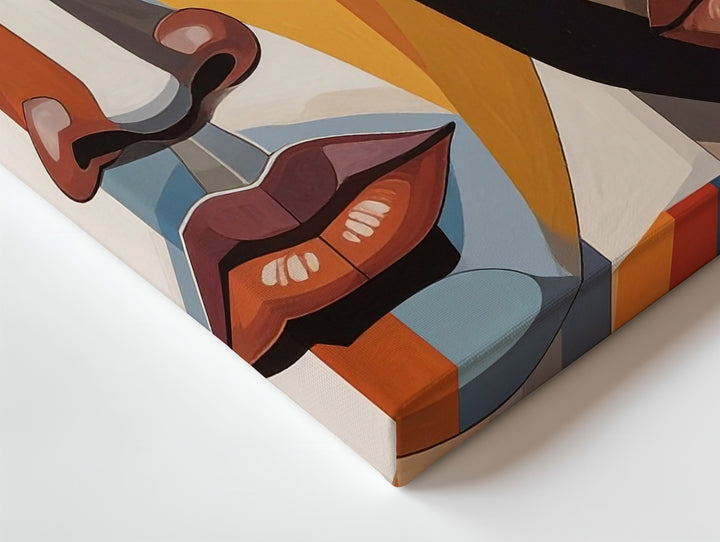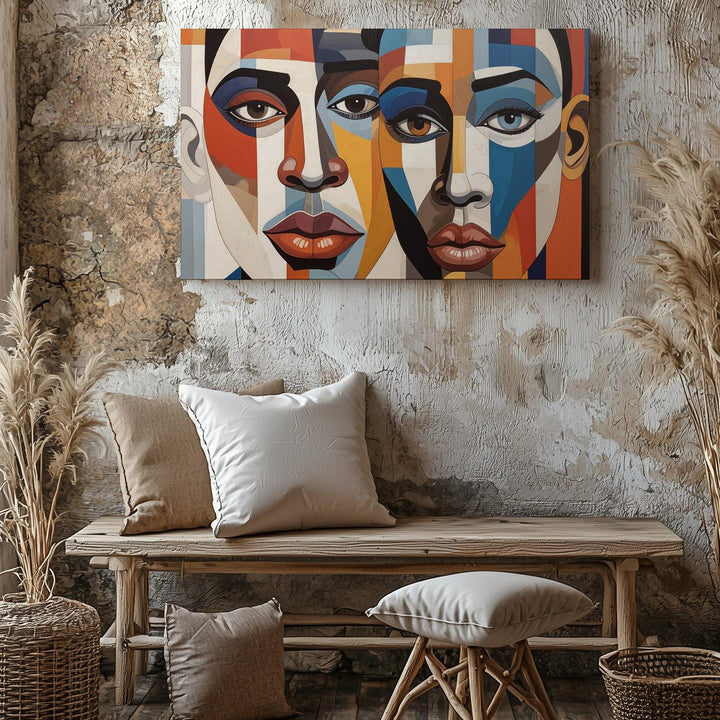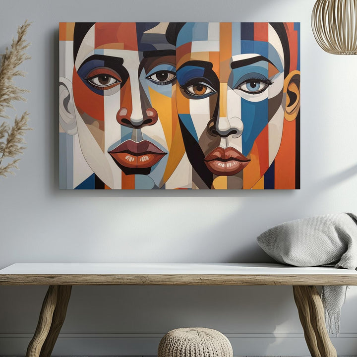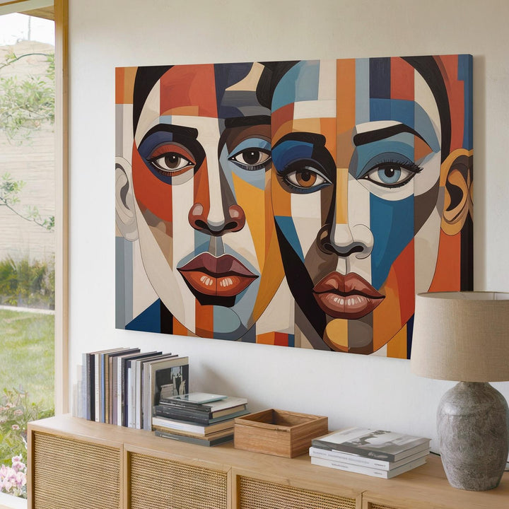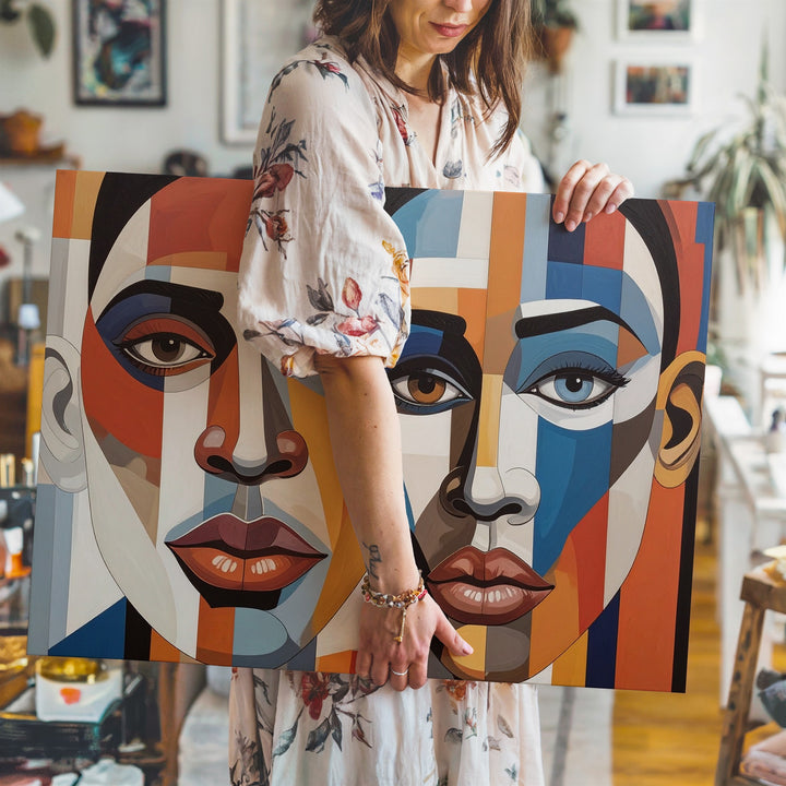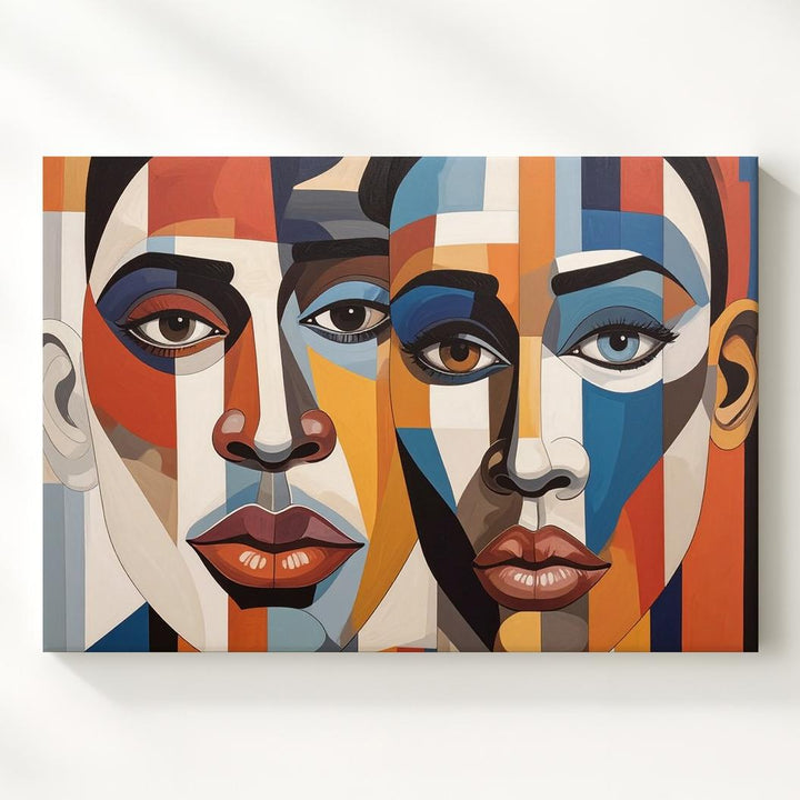 This striking abstract canvas captures the essence of unity and diversity through the overlapping faces of two stylized figures. Constructed with bold lines and vibrant colors—orange, blue, white, and black—the faces merge in a geometric dance, where one half blends into the other. The background of vertical color blocks further divides the faces, symbolizing the complexity of identity and the beauty of connection. With its high-impact design and neutral expressions, this modern piece speaks to the themes of love, unity, and the power of diversity in a visually bold and expressive way.