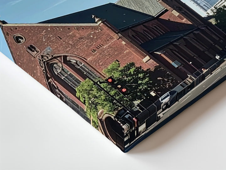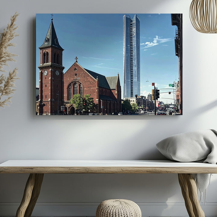 This detailed urban canvas captures a striking coexistence: a red-brick church with a classic clock tower stands proudly before a towering modern skyscraper of gleaming glass. Crisp midday light casts defined shadows, while street signs, traffic lights, and parked cars ground the scene in everyday realism. It’s a powerful portrait of a city shaped by memory and motion—where past and present rise side by side.