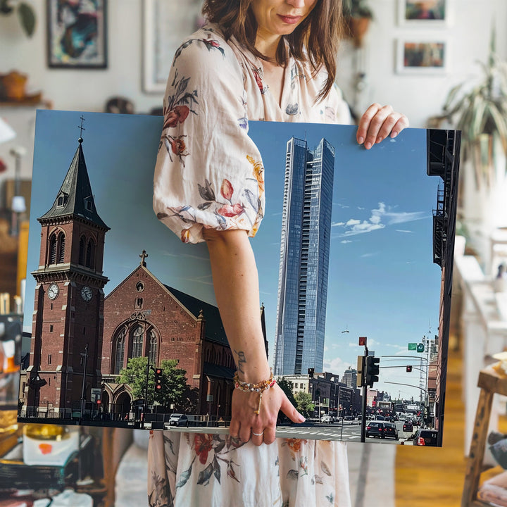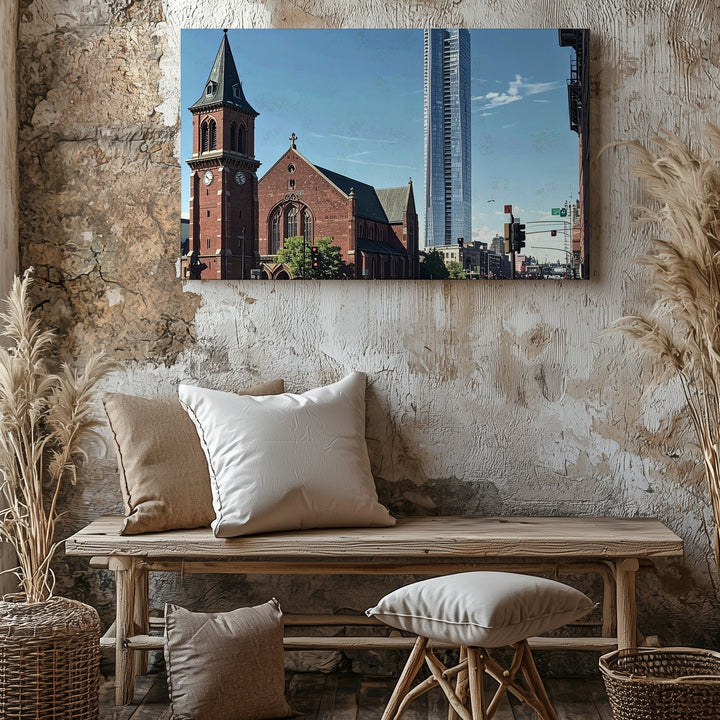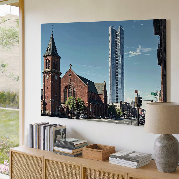 Heritage & Glass Canvas – Urban Contrast of Church and Skyscraper