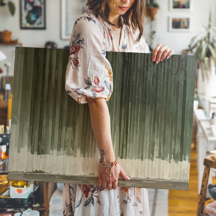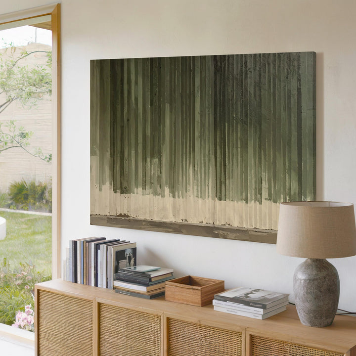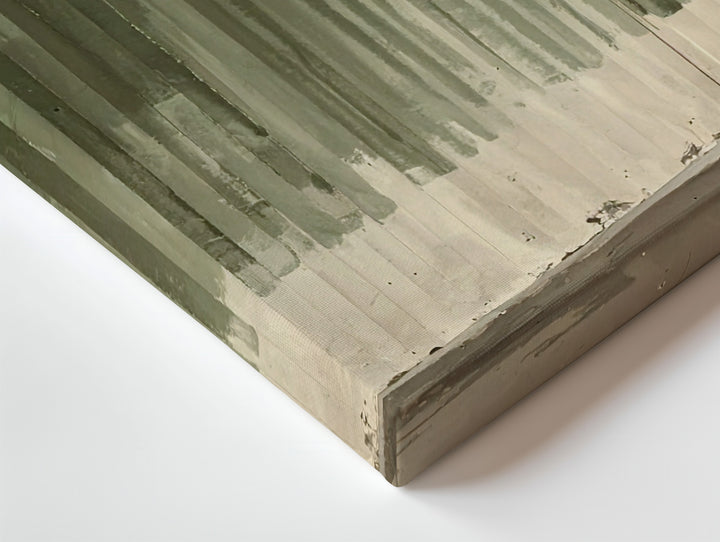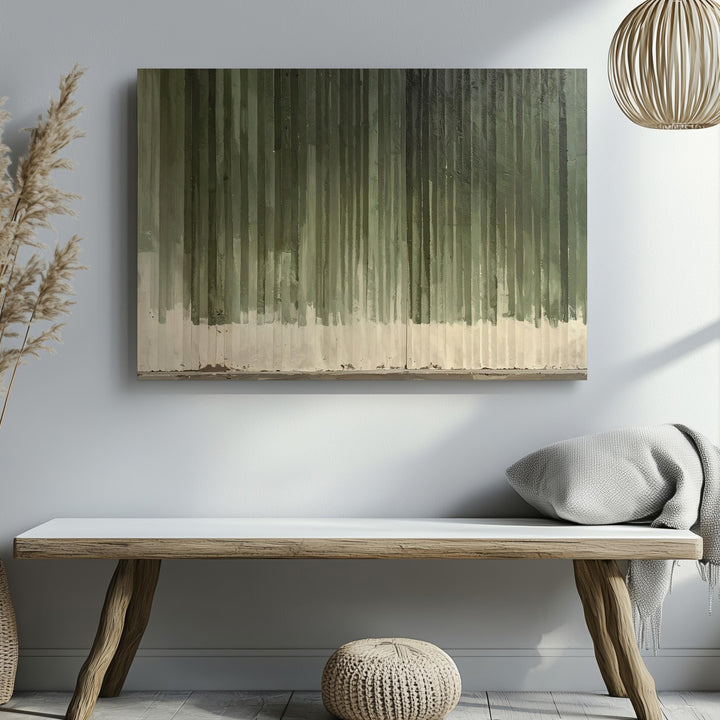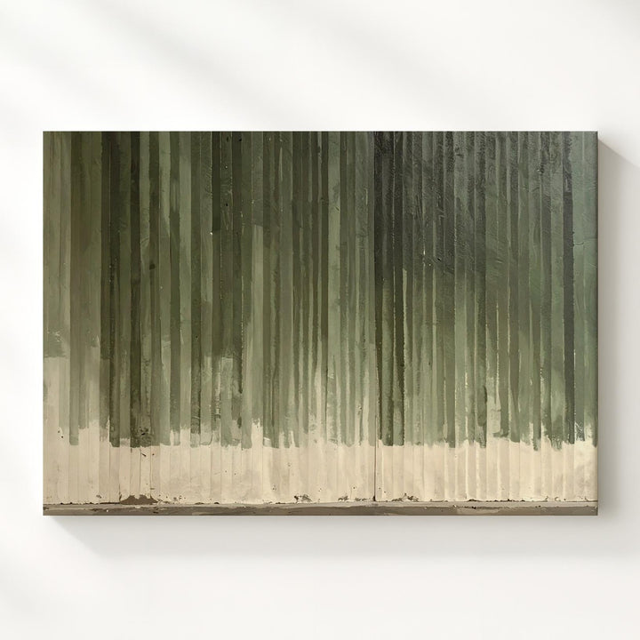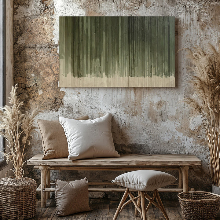 This minimalist abstract canvas features vertical stripes in varying deep greens across the top two-thirds, transitioning into a soft beige horizontal band below. The organic brushwork and uneven stripe widths create subtle texture and meditative repetition, while the grounded beige base balances the composition. A serene, architectural piece that brings structure and natural calm to modern interiors.