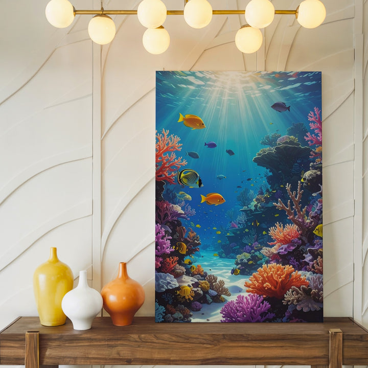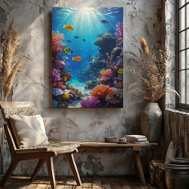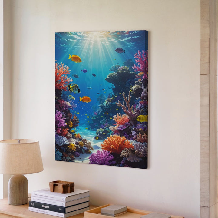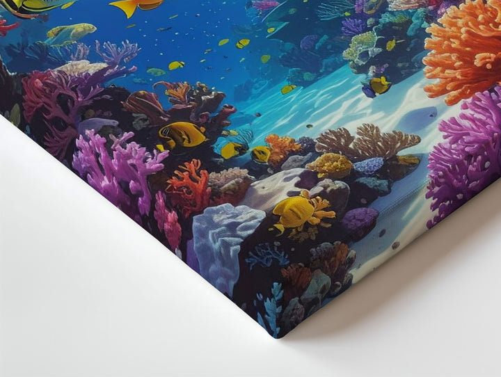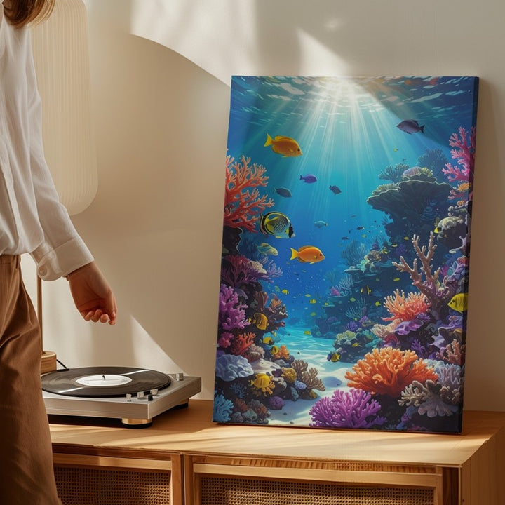 This stunning canvas captures a coral reef teeming with life, featuring a variety of coral types in both warm and cool tones—branching corals, brain corals, and soft coral clusters. Tropical fish in hues of yellow, orange, purple, and black swim gracefully across the frame, interacting with the reef and each other in a lively display of marine biodiversity. Sunlight pierces the water from above, illuminating the vibrant coral structures and casting moving shadows across the seabed. The clarity and detail of the scene create an immersive, lifelike experience, celebrating the beauty and richness of the reef ecosystem.