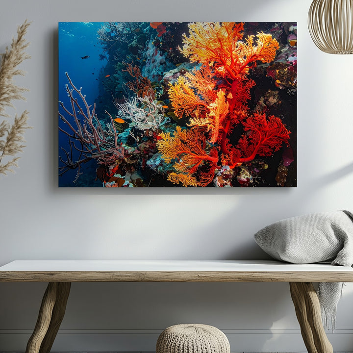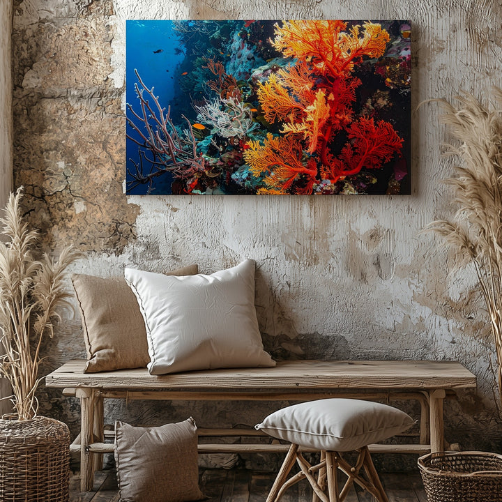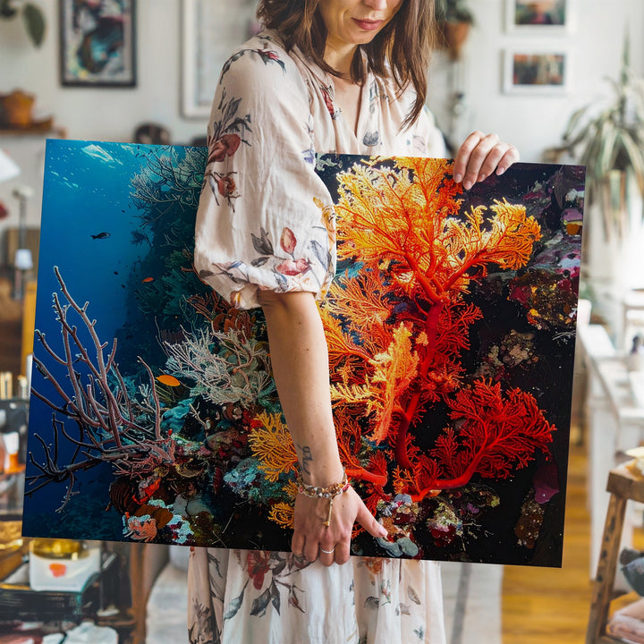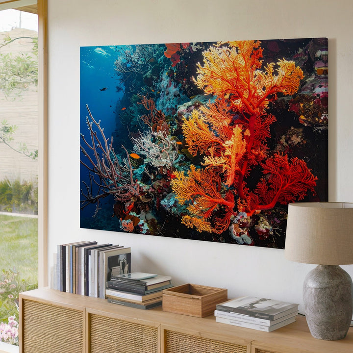 This striking canvas captures a close-up of a coral reef wall in full bloom, bursting with radiant reds, oranges, and textures that demand attention. Sprawling gorgonian sea fans reach outward like underwater flames, while tiny fish and marine creatures dart through sponge-covered crevices. Lit with dramatic natural highlights, the reef’s layered structure pops against the deep blue background, creating a vibrant portrait of the ocean’s most explosive, living tapestry.