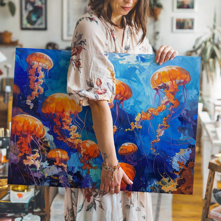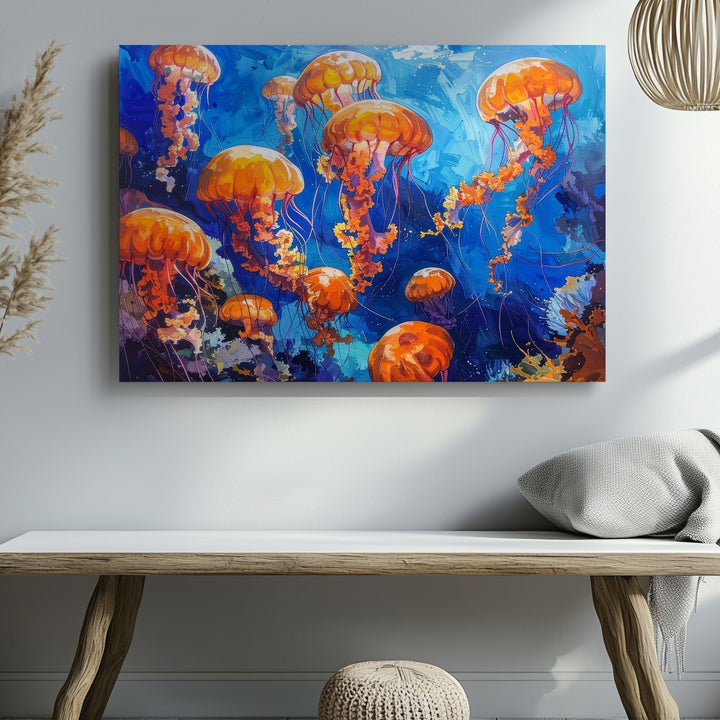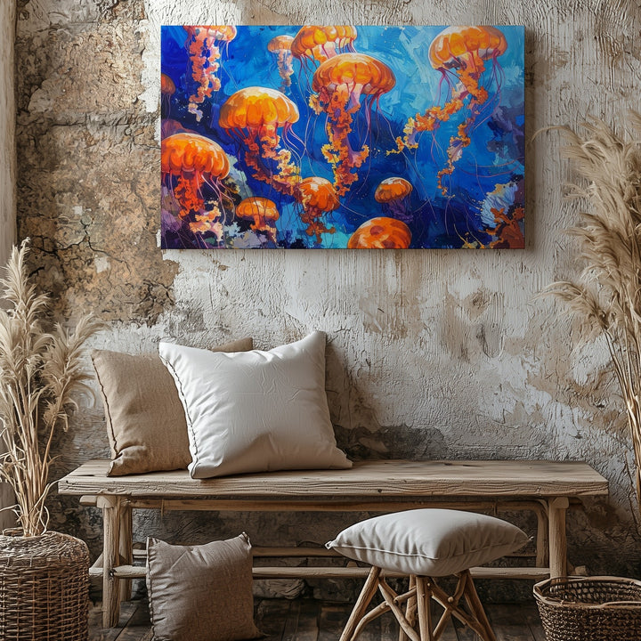This lively canvas bursts with a school of glowing orange jellyfish ascending through a bright blue ocean. Exaggerated, luminous bodies and flowing tentacles swirl energetically, creating a dynamic rhythm that fills the space with vibrant life. Bold contrasts and playful paint splatters add a spontaneous, artistic flair, capturing the magic and movement of an enchanting underwater journey.