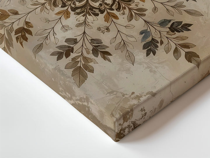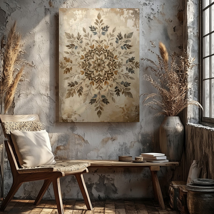 This vintage-style canvas features a symmetrical snowflake design crafted from dried leaves, twigs, and muted foliage in earthy, organic tones. Set against a textured beige background that evokes the warmth of aged parchment, the piece blends botanical art with the symbolism of winter. The soft browns, grays, and greens create a rustic and refined feel, bringing the natural world into your space with subtle sophistication. It’s a unique and elegant take on seasonal decor that celebrates the quiet charm of winter’s simplicity.