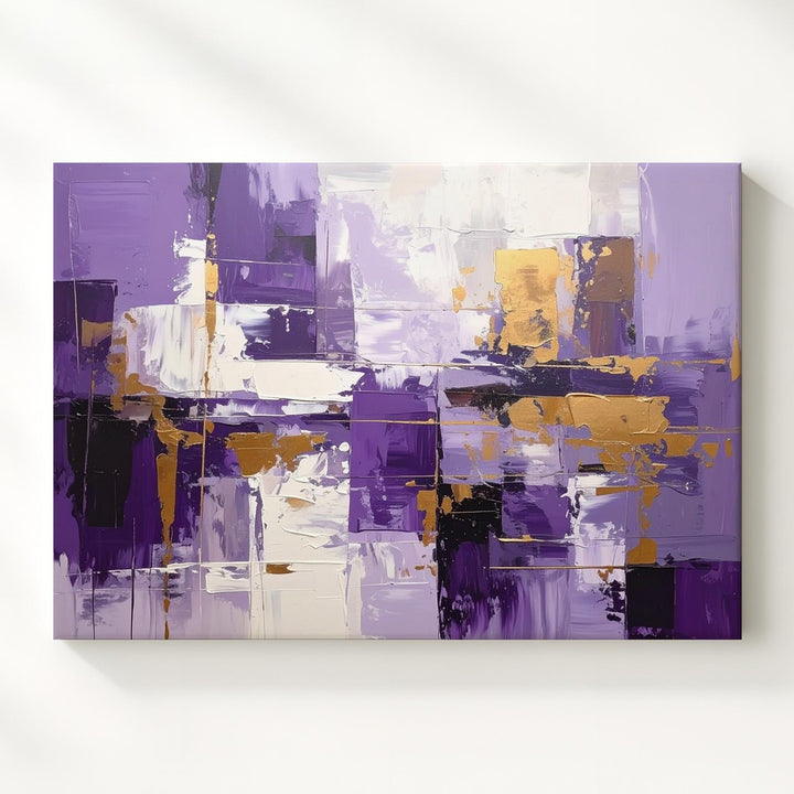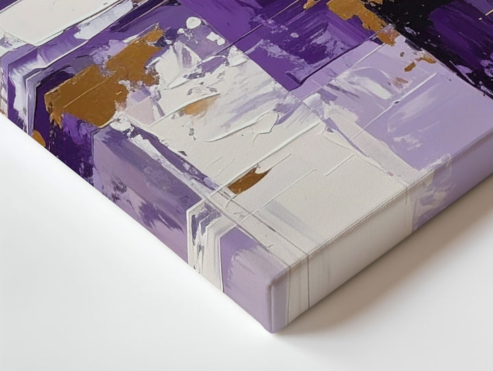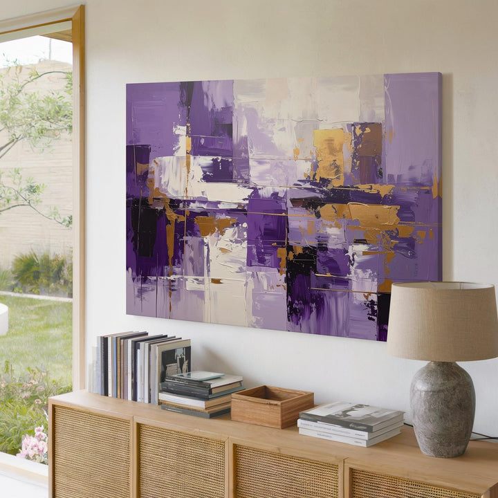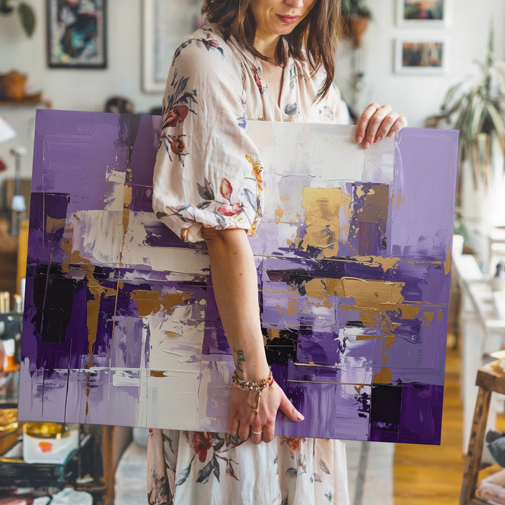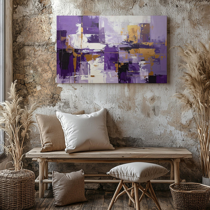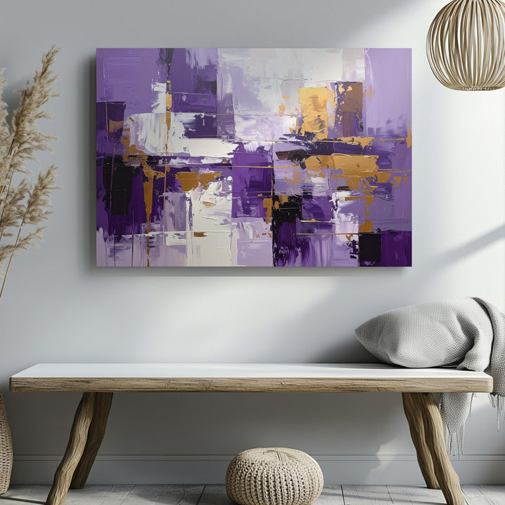 This dynamic abstract canvas features bold vertical and horizontal brushstrokes in rich purples, crisp whites, and warm golden ochre accents. The layered rectangles and expressive textures evoke the rhythm of a cityscape or architectural geometry, balancing vibrant color with structured energy. A lively, modern statement piece that brings passion and movement to contemporary interiors.