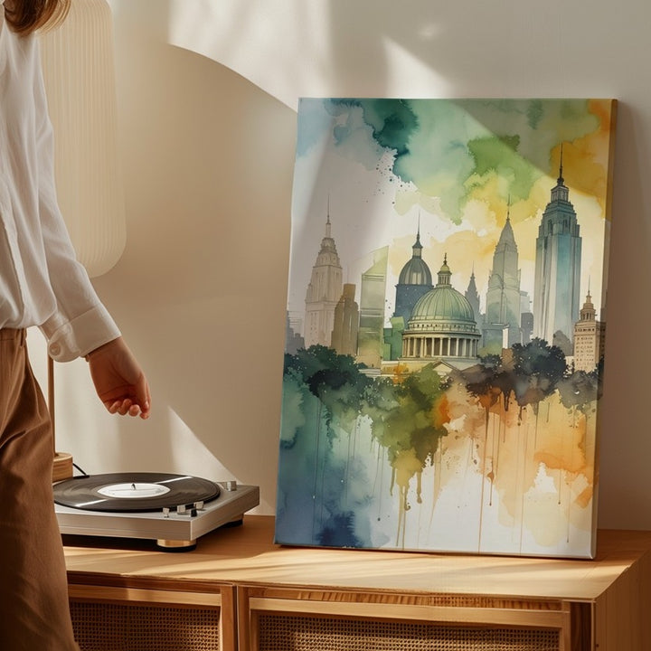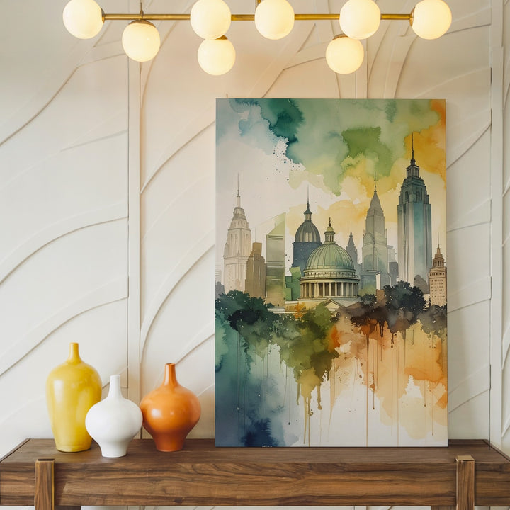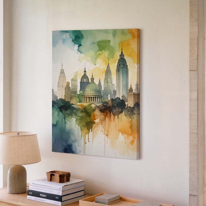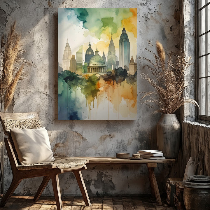 This expressive watercolor canvas blends iconic cityscapes from around the world into a unique urban dream. The skyline, painted in a gradient wash of green, yellow, and orange, features the silhouettes of famous domes, towers, and skyscrapers. The soft, bleeding edges and dripping ink splashes give the piece an abstract, artistic quality that blurs the lines between architecture and imagination. The lively color palette reflects the dynamism of the city, while the loose brushwork evokes spontaneity and creative energy. Perfect for those who seek art that captures both the spirit and the soul of urban life.