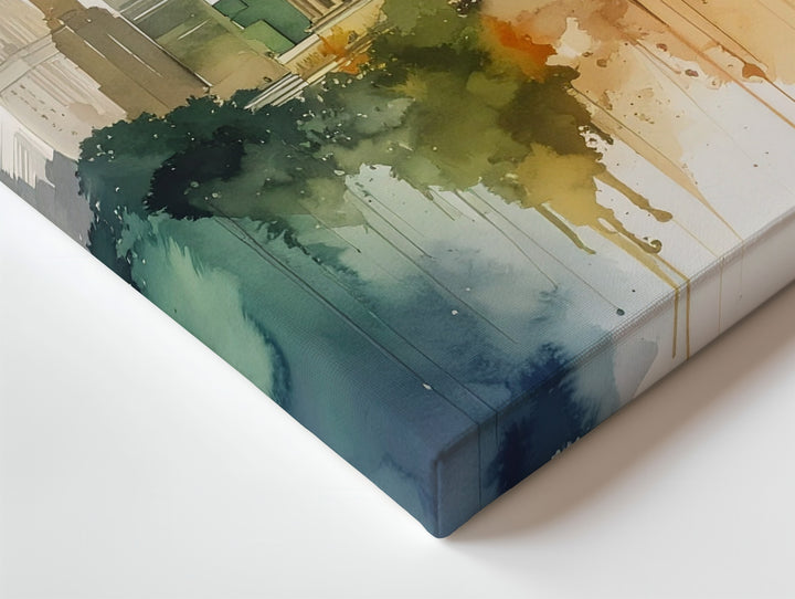 Watercolor City Skyline Canvas – Abstract Urban Landscape with Ink Splashes