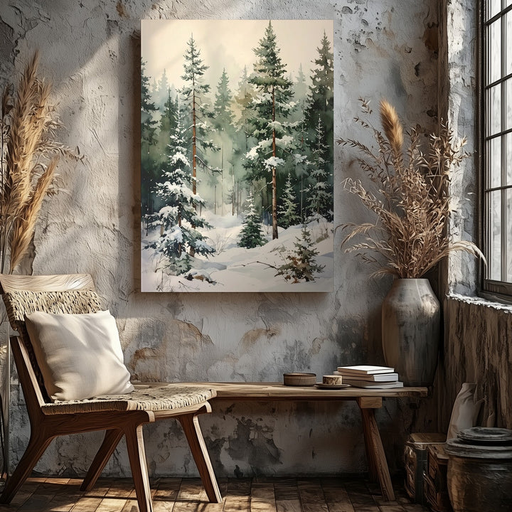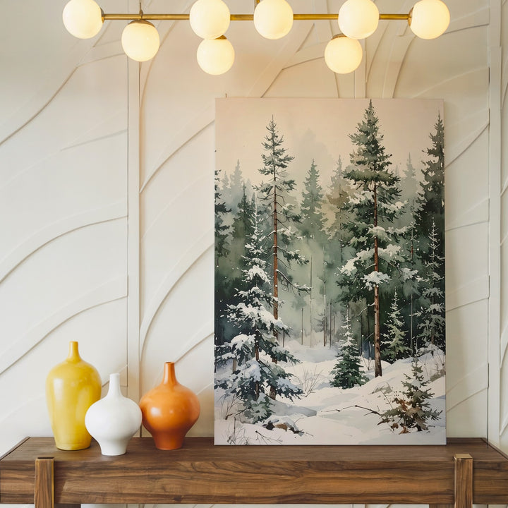 This delicate watercolor-style canvas invites you into a quiet winter forest where tall pine trees stand gracefully against a soft beige background. Each tree’s frosted branches and snow-kissed bases blend softly with muted greens and earth tones, creating a natural, flowing rhythm. The gentle leaning of some trees and the subtle textures evoke peaceful introspection and the calm stillness of a winter woodland moment.