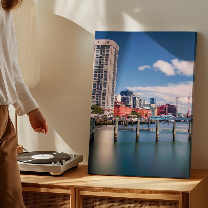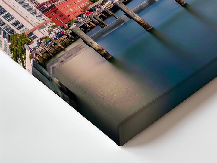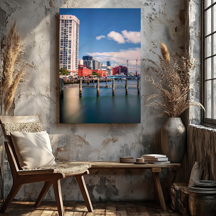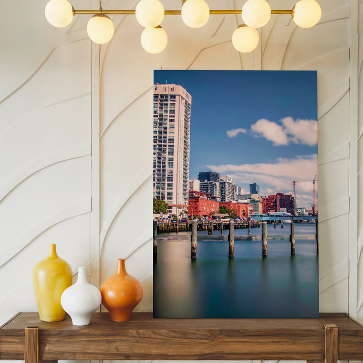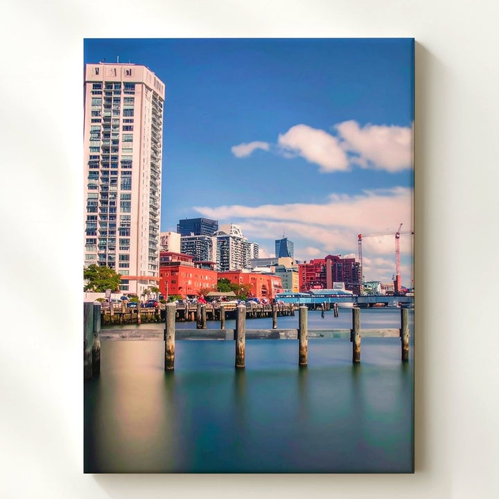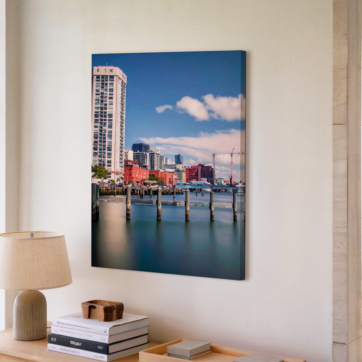 Waterfront Cityscape Canvas – Modern Architecture with Colorful Buildings and Pylons