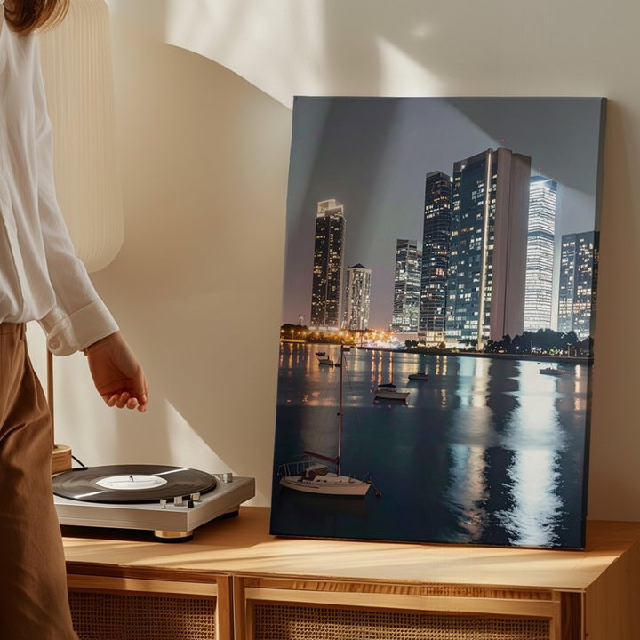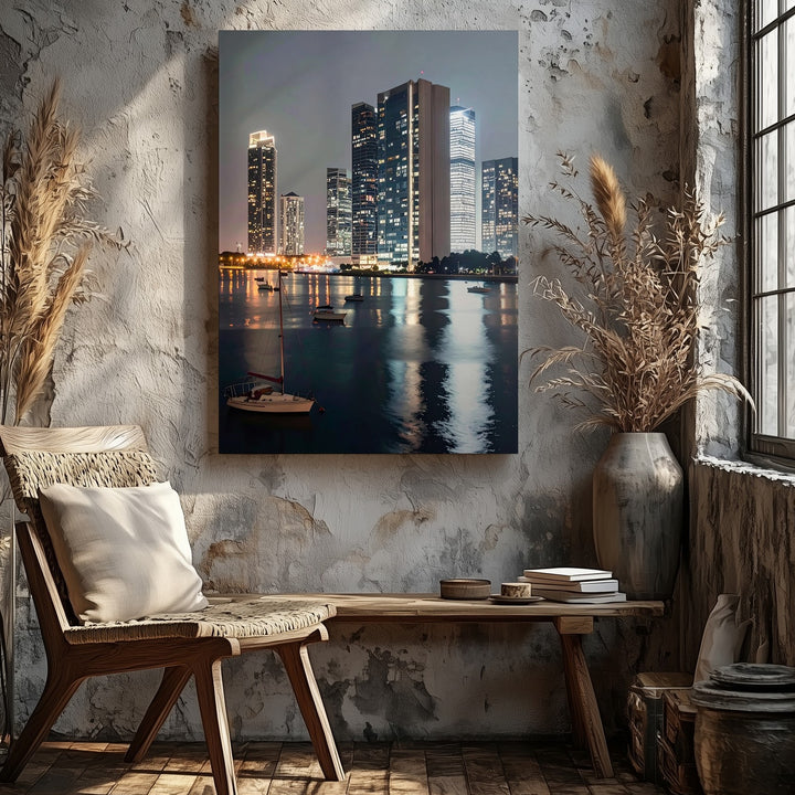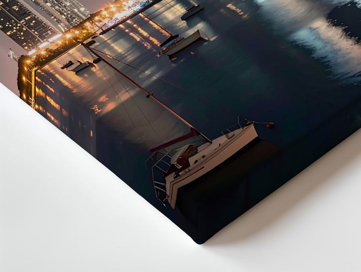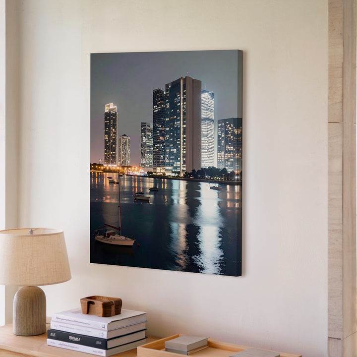Waterfront Skyline Canvas – Night Scene with Glass Towers and Sailboats