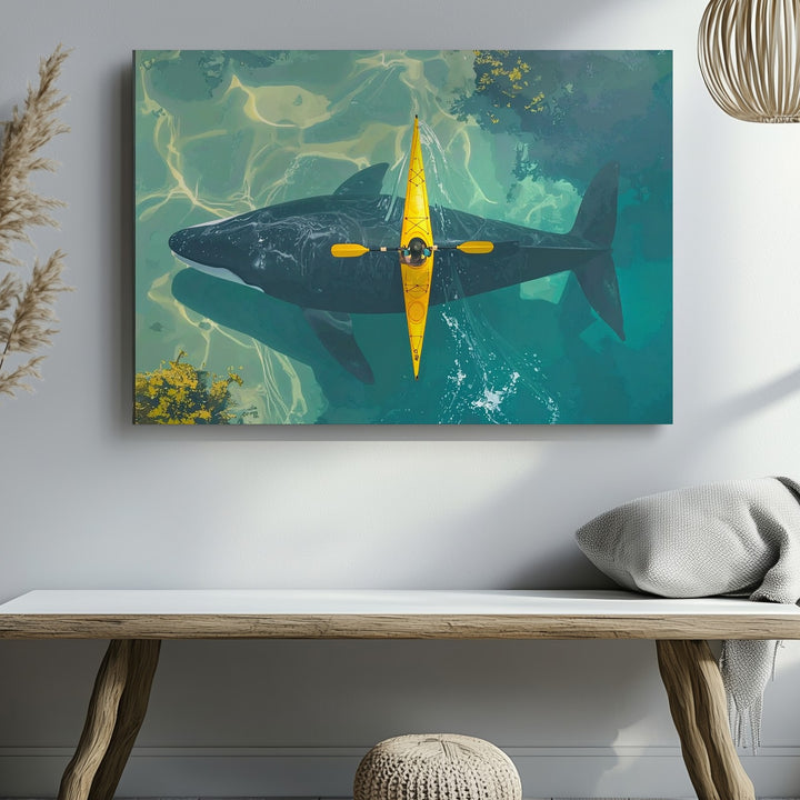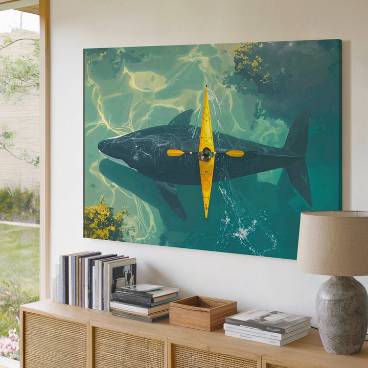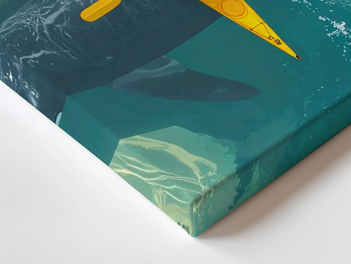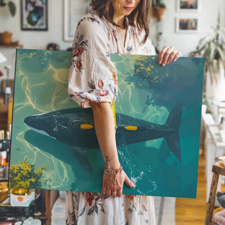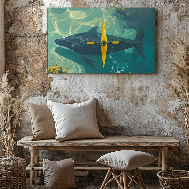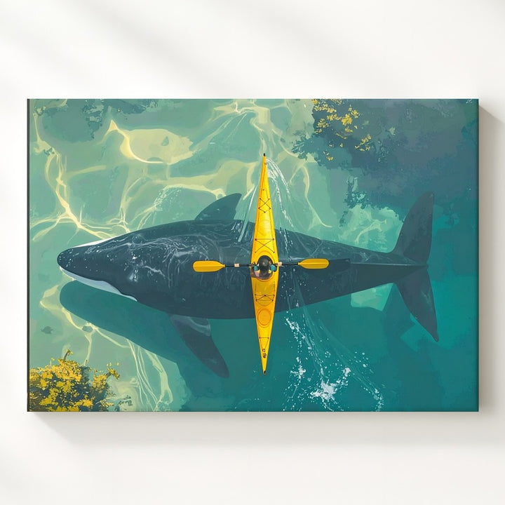This awe-inspiring aerial canvas captures the delicate balance between human presence and marine majesty. A lone yellow kayak glides across crystal-clear turquoise water, leaving a soft trail behind. Beneath the surface, the shadowy form of a massive whale emerges—partly obscured, entirely humbling. The play of transparency, scale, and light transforms the scene into a powerful meditation on wonder, scale, and our place within the vast ocean.