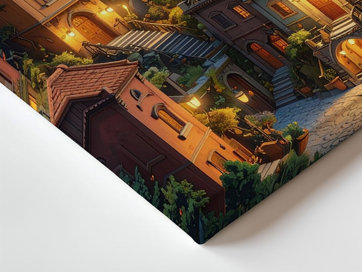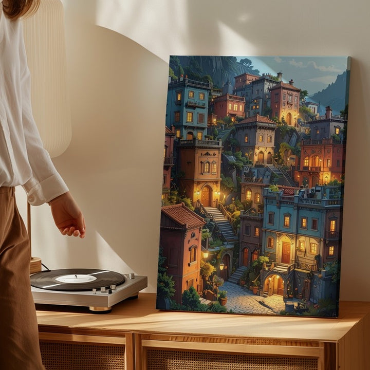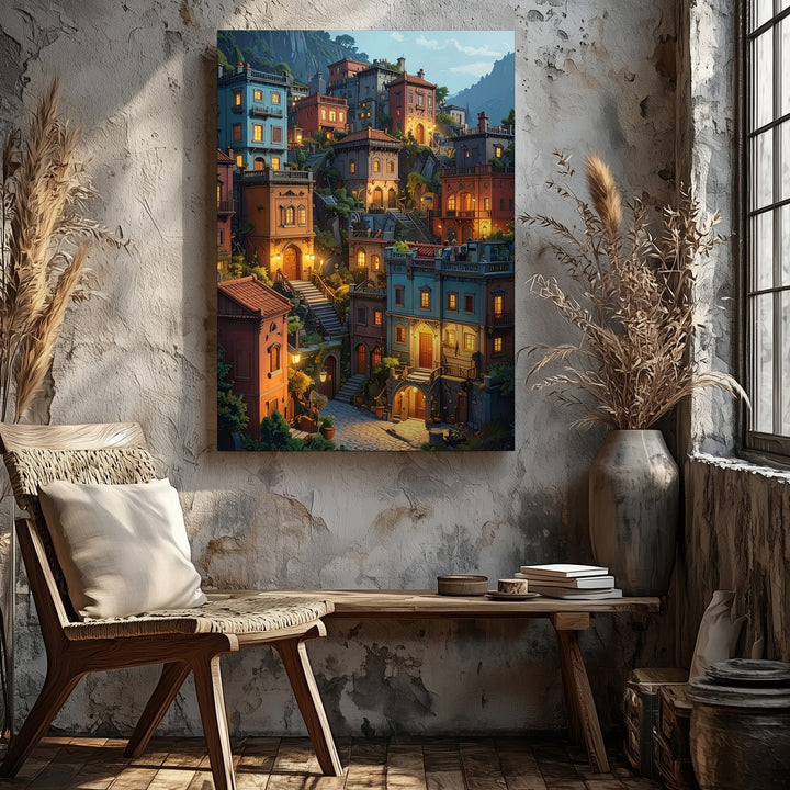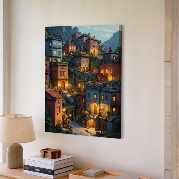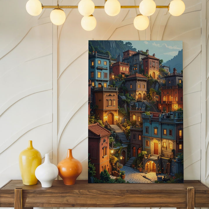 This richly detailed digital painting depicts a hillside village bathed in soft, golden light. The towering, colorful buildings, each with winding staircases, glowing windows, and charming balconies, create a fairy-tale atmosphere. The cool blue night sky contrasts beautifully with the warm light spilling from the windows, while lush greenery peeks through the gaps between the structures. Cobblestone paths meander up the slope, enhancing the sense of depth and magic. This canvas invites you into a secluded, timeless neighborhood full of charm and wonder.