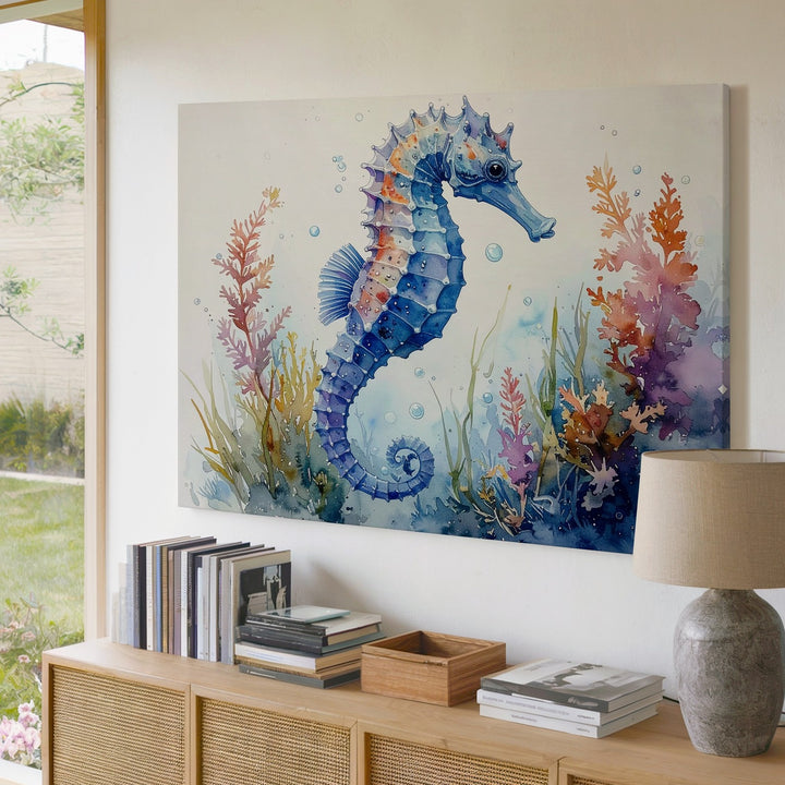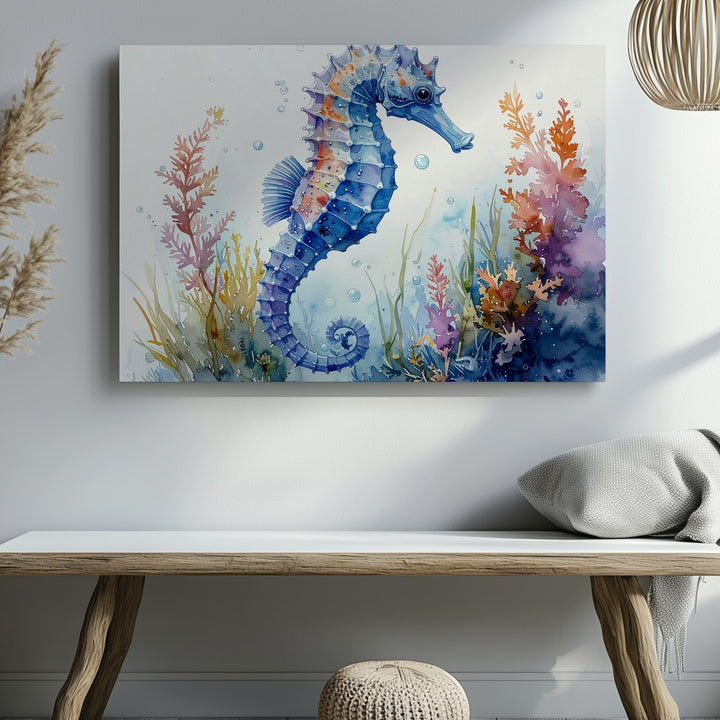 This enchanting watercolor canvas features a delicately detailed seahorse suspended in a serene underwater world. Painted in dreamy gradients of blue, purple, and coral, the creature drifts among pastel sea ferns and soft aquatic flora. Tiny bubbles rise gently around its curled tail, evoking a sense of lightness, magic, and calm. The bright white background enhances the airy charm of this fairytale-like marine scene.