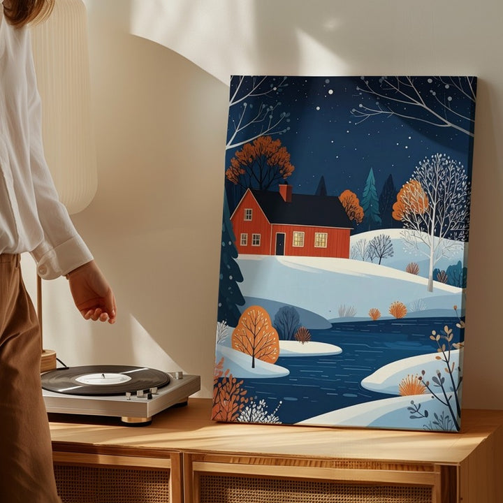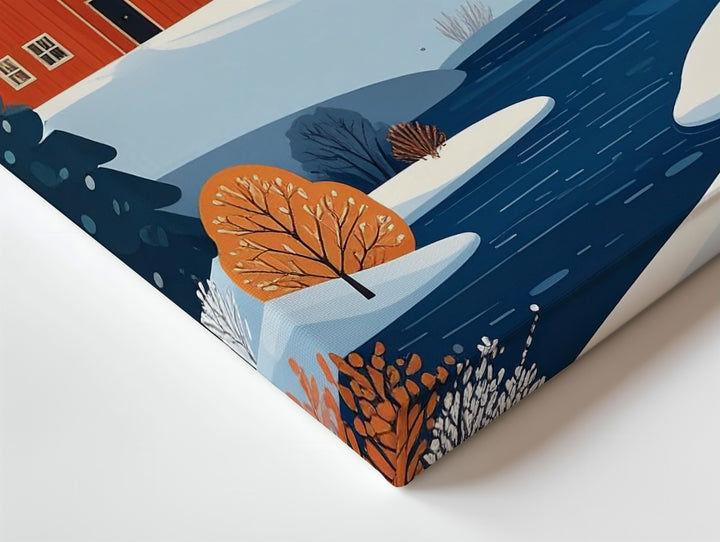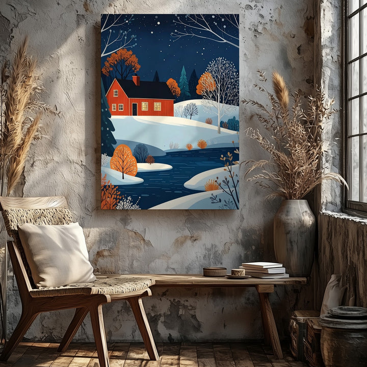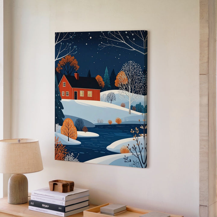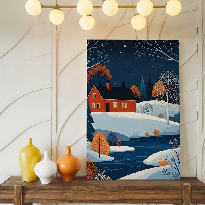 This enchanting canvas showcases a bright red house with a black roof nestled in a snowy landscape, illuminated under a deep blue night sky. The surrounding abstract trees in shades of orange, white, and teal create a vibrant contrast against the serene snow-covered hill. A gentle river winds through the scene, reflecting the magical atmosphere, while falling snowflakes and bare branches add a layer of charm and tranquility. It’s the perfect winter escape—a dreamy, cozy setting that invites imagination and wonder into your space.