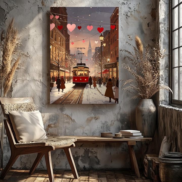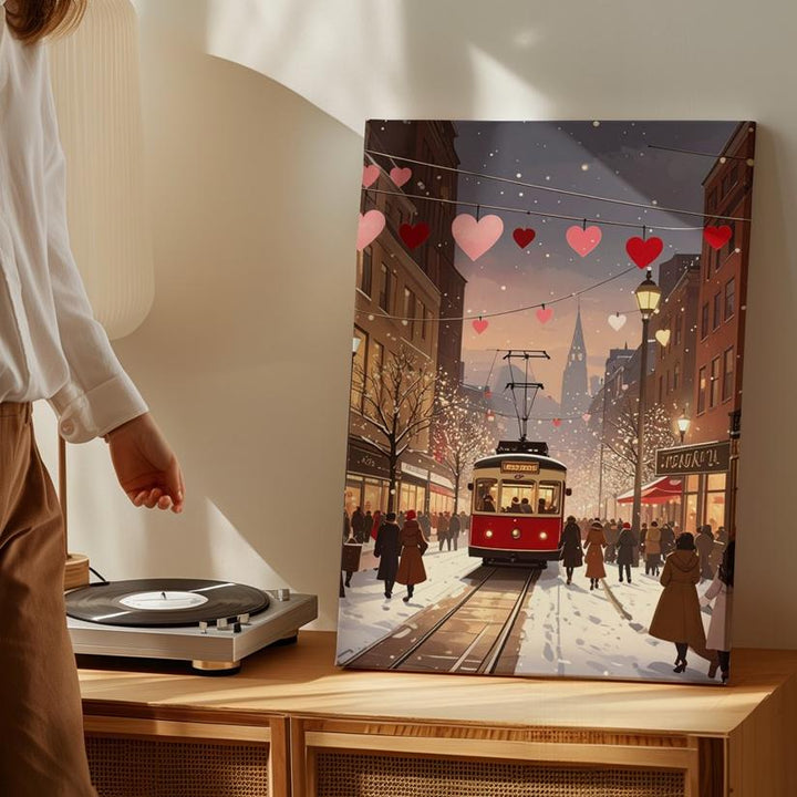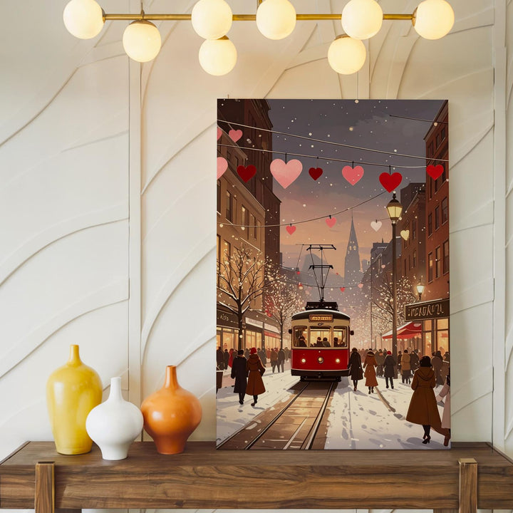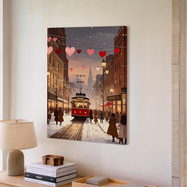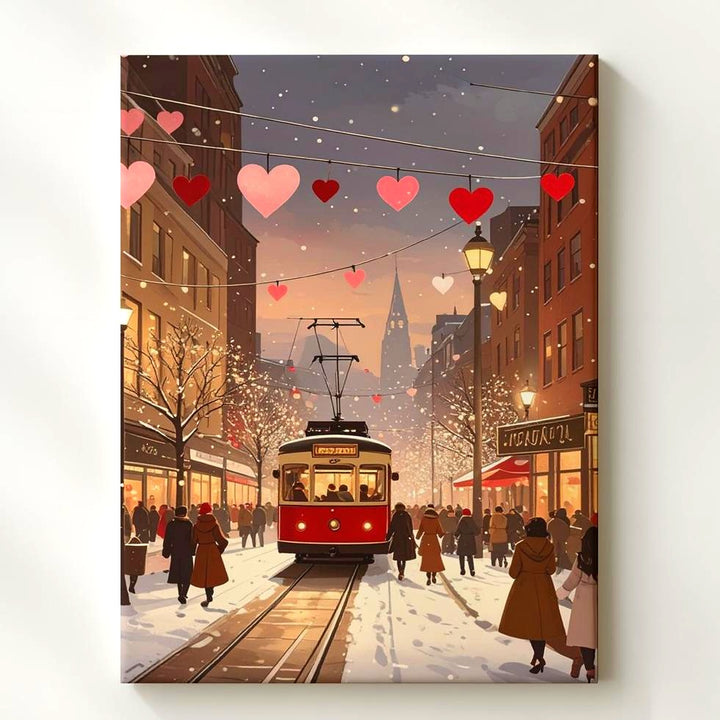 This charming canvas captures a romantic city street scene at dusk, where a red tram glides along snowy tracks beneath festive string lights adorned with pink and red hearts. The street bustles with people wrapped in warm coats, creating an atmosphere of coziness and joy. Soft golden tones from the glowing windows of tall buildings mix with cool snowy whites, evoking the warmth of togetherness and the festive spirit of winter love.
