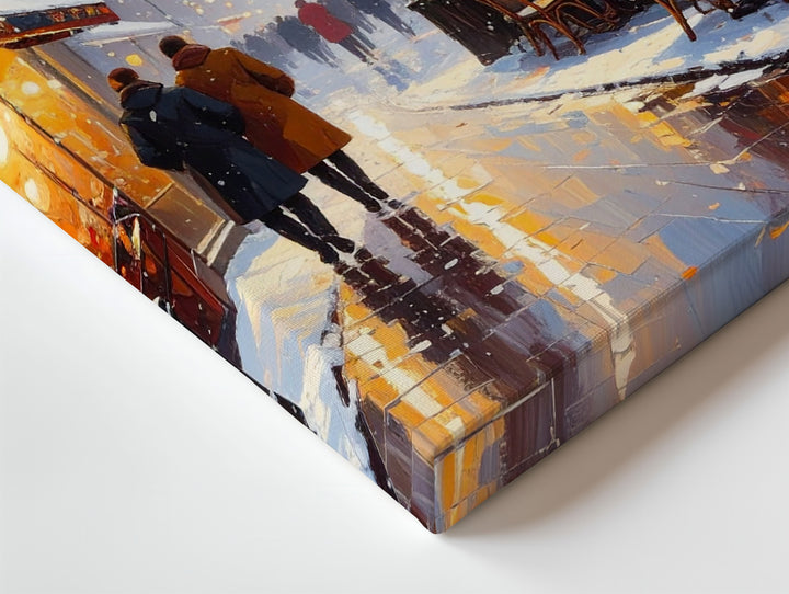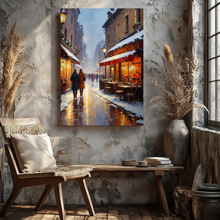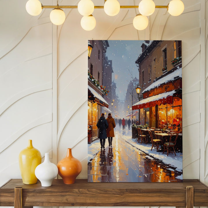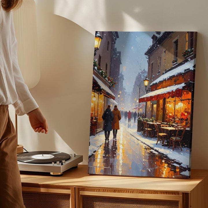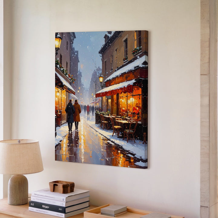 This charming canvas captures a snowy winter evening where softly falling snow mingles with the golden glow of street lanterns and bistro lights. Outdoor cafés bustle gently under heat lamps, their cozy tables dusted with snow while warmly dressed passersby stroll along wet, reflective streets. Vintage European architecture and festive decor blend into a nostalgic scene full of community, comfort, and the simple magic of winter city life.