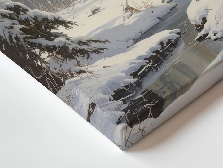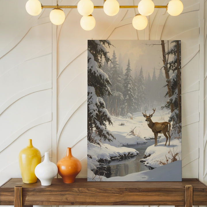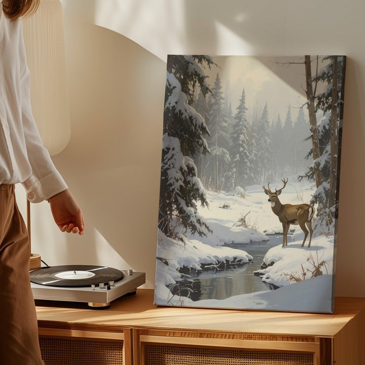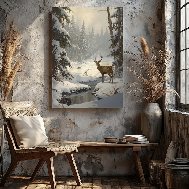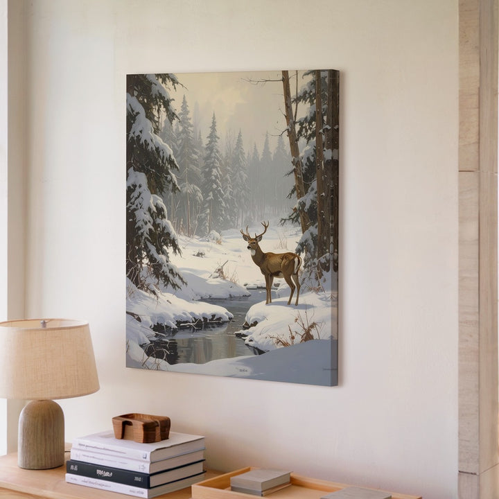 Winter Deer by Frozen Stream Canvas – Serene Wilderness Wall Art