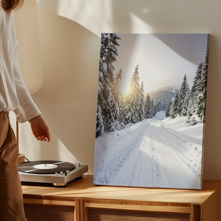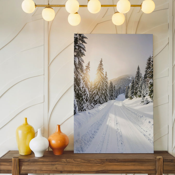 Golden Glow Mountain Road Canvas – Serene Winter Sunrise Wall Art
