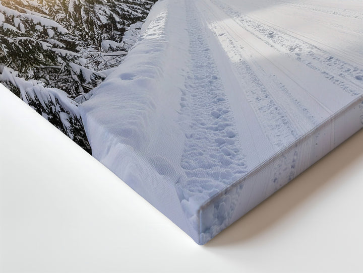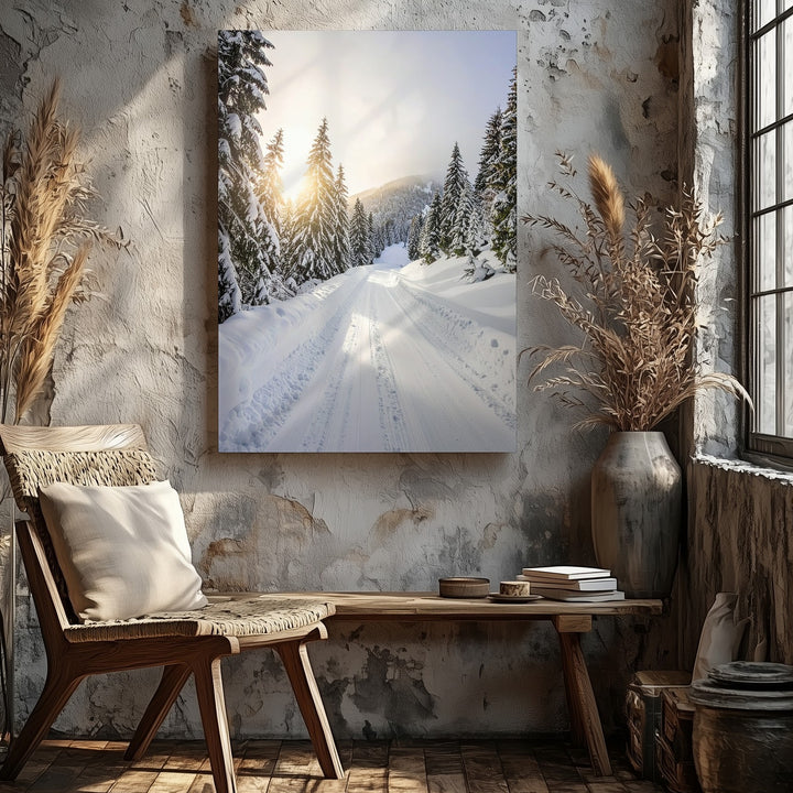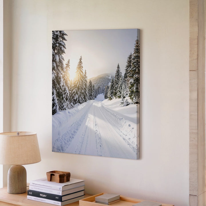 This serene canvas captures a pristine snow-covered mountain road winding through a forest of towering pines heavy with snow. The soft golden glow of sunrise or sunset filters gently through branches, casting warm light across crisp snowbanks and shadows. The untouched path invites calm reflection and hopeful new beginnings amid the tranquil beauty of winter’s embrace.