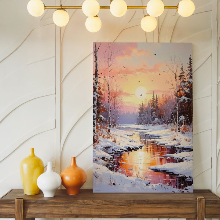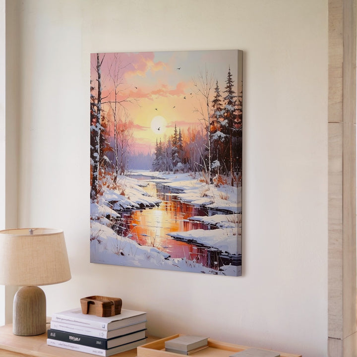 This tranquil canvas depicts a partially frozen river winding gently through a snowy forest beneath a warm golden-orange sunset. Bare trees and evergreens line the banks, their reflections shimmering in the calm water. Silhouetted birds glide overhead, adding life to the peaceful scene where snow embraces the fading light. It’s a perfect portrayal of winter’s gentle transitions and the harmonious balance of light and nature.
