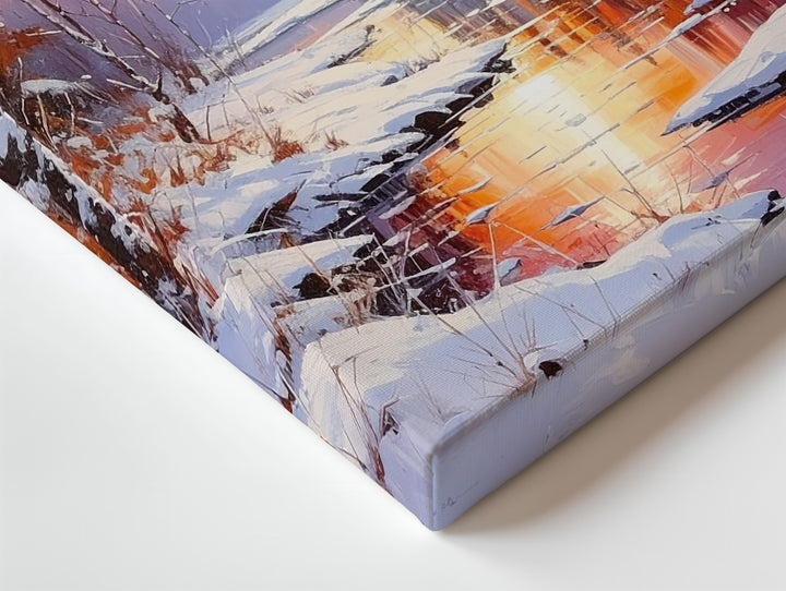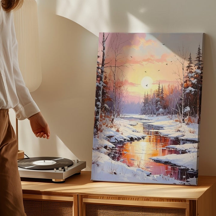 Golden Sunset Winter River Canvas – Serene Snowy Forest Landscape