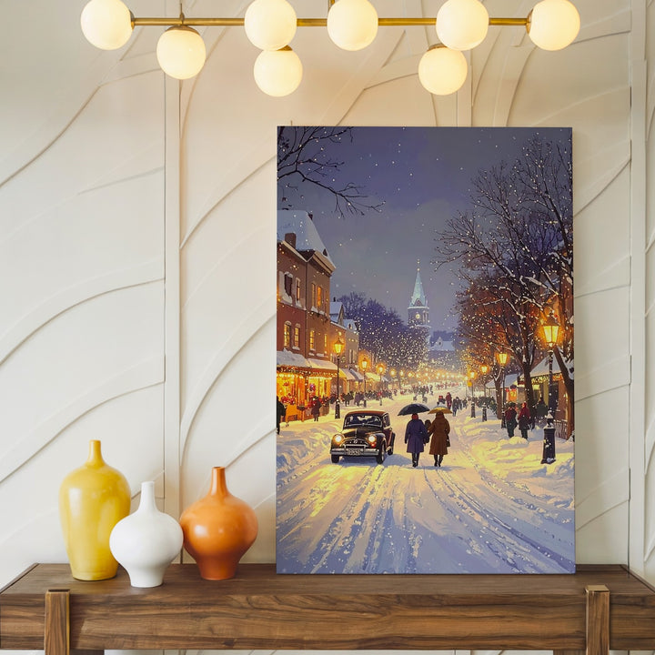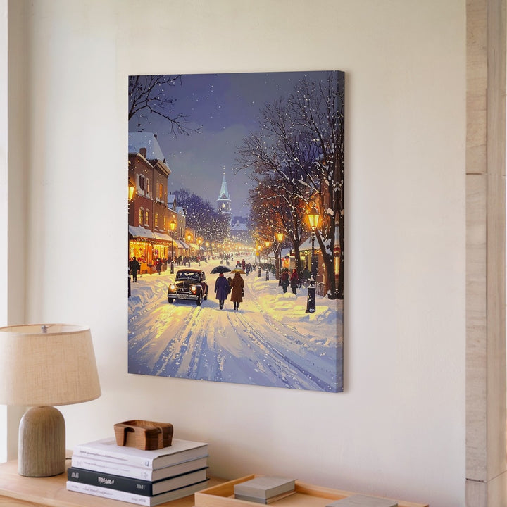 This romantic canvas captures a dreamy winter street scene, where freshly fallen snow blankets the ground and trees, and glowing yellow-orange street lamps cast a soft, inviting light across the cold surroundings. A vintage car slowly drives through the snow, its headlights glowing faintly through the mist. People walk under umbrellas, leaving footprints in the fresh snow, while cozy windows in nearby buildings glow warmly. The bare trees arch gracefully over the street, their branches outlined in white snow, creating a magical atmosphere. A perfect tribute to the serene beauty of an old European town on a snowy evening.