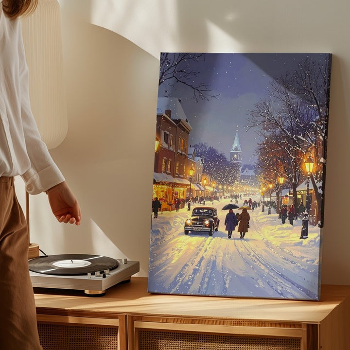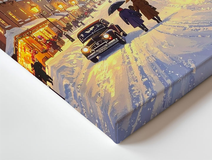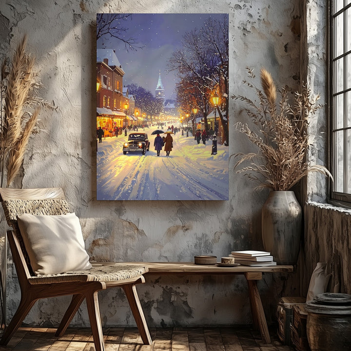 Winter Romance Canvas – Impressionistic Snowy Street Scene with Vintage Car