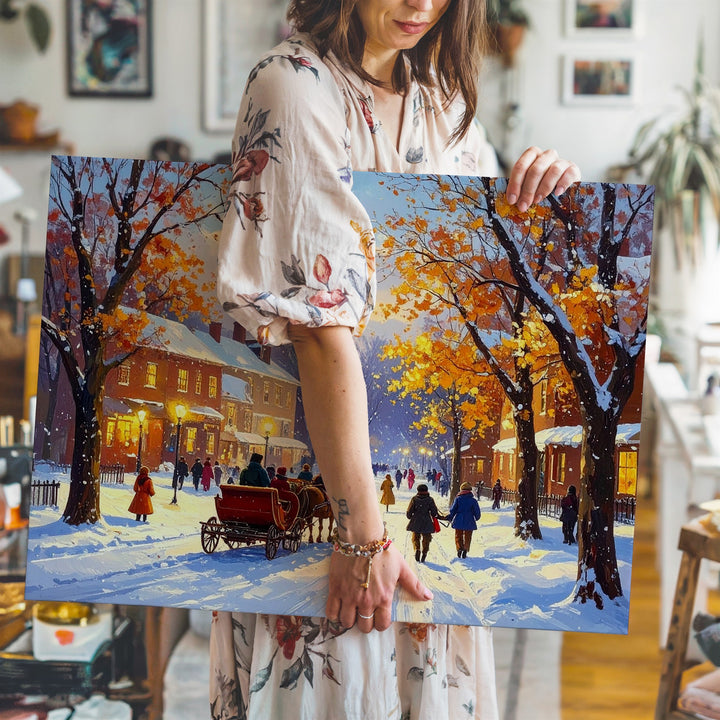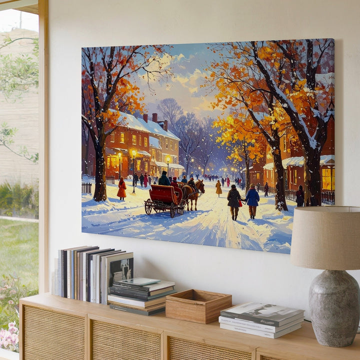 This cozy canvas captures the quiet magic of a snow-blanketed town as autumn yields to winter. A horse-drawn sleigh glides through thick snow, carrying warmly bundled passengers beneath a canopy of trees. Golden light spills from glowing windows, and townsfolk stroll gently along white-dusted paths. With painterly textures and soft colors, this artwork evokes the warmth of community, the stillness of snowfall, and the timeless wonder of the season.