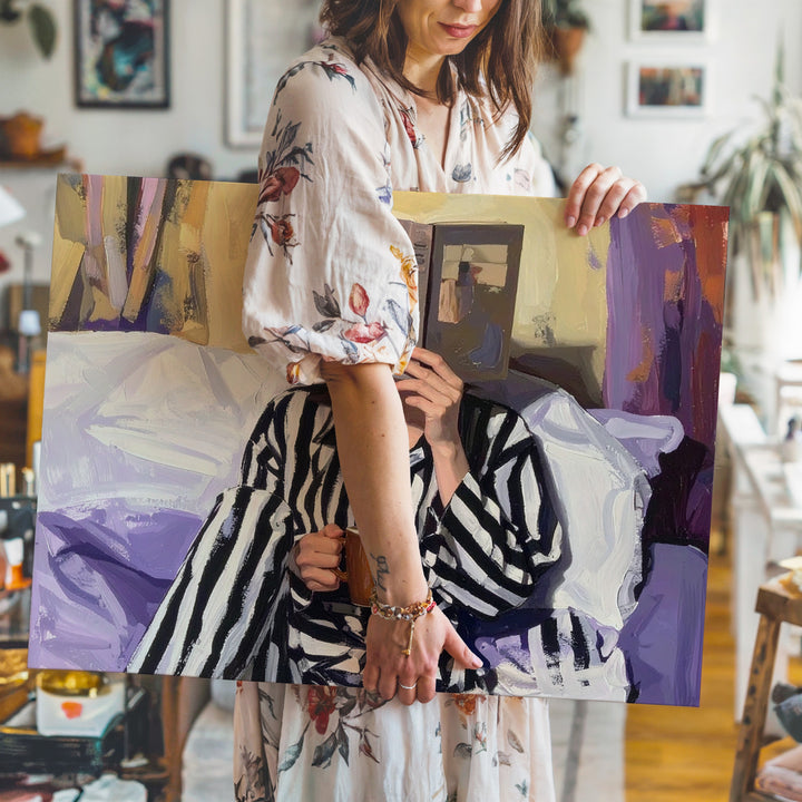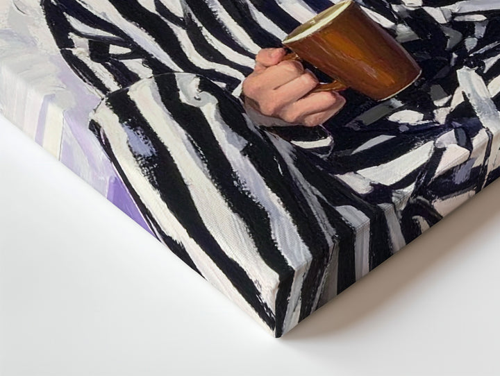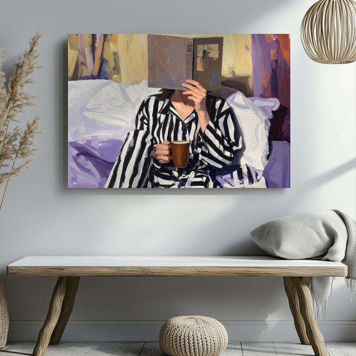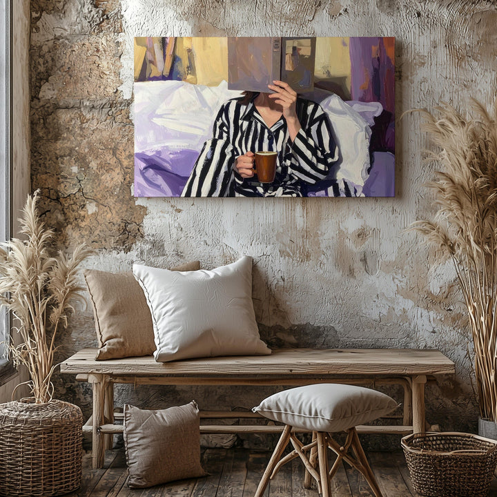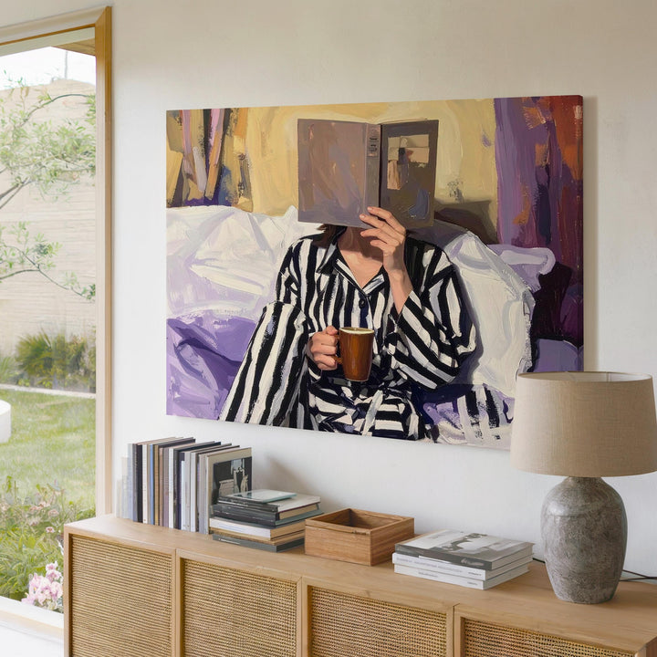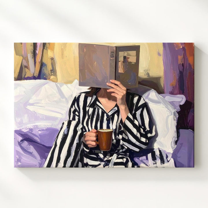 This cozy figurative canvas captures the quiet beauty of everyday stillness: a woman lost in her book, her striped black-and-white outfit boldly contrasting against a muted yellow backdrop. A warm brown coffee mug rests in her hand, while lavender and white bedding softens the scene. Expressive brushstrokes and textured detail add intimacy and warmth to this modern portrait of comfort and presence.