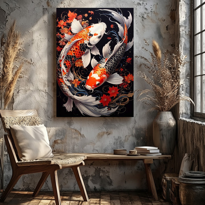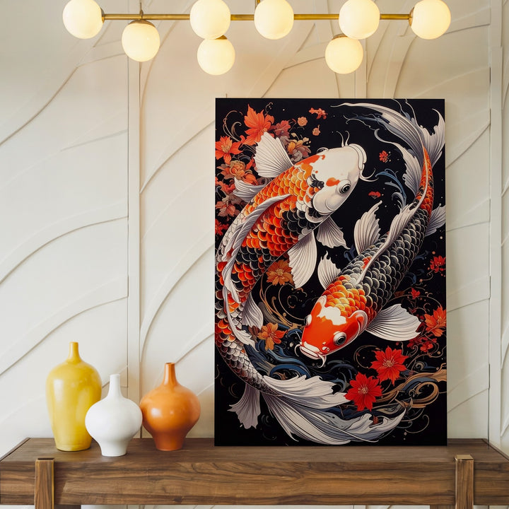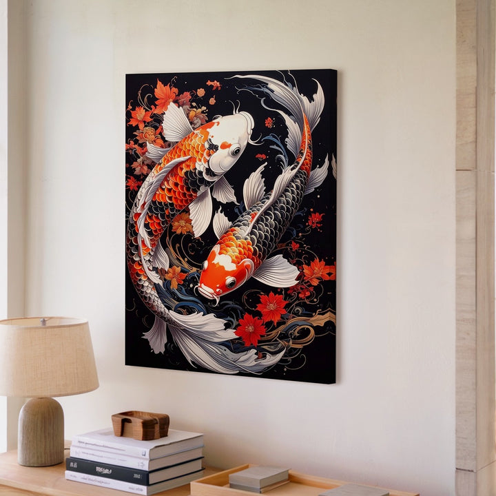 This striking canvas captures two koi fish, spiraling in perfect harmony in a dynamic, yin-yang formation. Their flowing fins and tails, painted in white, orange, and black hues, swirl like silk against a bold, pure black background. Each detailed scale shines with realistic depth, while red and orange maple leaves float around them, evoking the changing seasons. The perfect blend of traditional Japanese artistry and modern digital precision, this artwork embodies motion, peace, and timeless beauty.